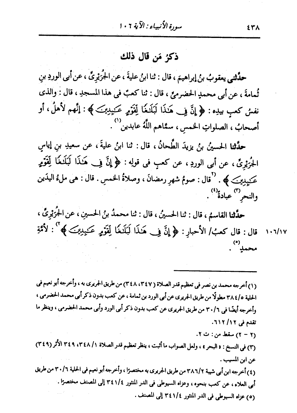 ذِكْرُ مَنْ قَالَ ذَلِكَ: حَدَّثَنِي يَعْقُوبُ بْنُ إِبْرَاهِيمَ، قَالَ: ثنا ابْنُ عُلَيَّةَ، عَنِ الْجُرَيْرِيِّ، عَنْ أَبِي الْوَرْدِ بْنِ ثُمَامَةَ، عَنْ أَبِي مُحَمَّدٍ الْحَضْرَمِيِّ، قَالَ: ثنا كَعْبٌ، فِي هَذَا الْمَسْجِدِ قَالَ: وَالَّذِي نَفْسُ كَعْبٍ بِيَدِهِ {إِنَّ فِي هَذَا لَبَلَاغًا لِقَوْمٍ عَابِدِينَ} [الأنبياء: 106] «§إِنَّهُمْ لَأَهْلُ أَوْ أَصْحَابُ الصَّلَوَاتِ الْخَمْسِ، سَمَّاهُمُ اللَّهُ عَابِدِينَ»