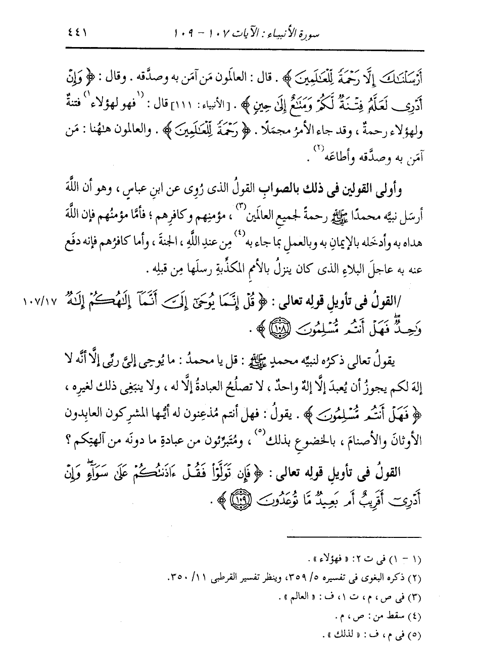 §الْقَوْلُ فِي تَأْوِيلِ قَوْلِهِ تَعَالَى: {قُلْ إِنَّمَا يُوحَى إِلَيَّ أَنَّمَا إِلَهُكُمْ إِلَهٌ وَاحِدٌ فَهَلْ أَنْتُمْ مُسْلِمُونَ} [الأنبياء: 108] يَقُولُ تَعَالَى ذِكْرُهُ لِنَبِيِّهِ مُحَمَّدٍ صَلَّى اللهُ عَلَيْهِ وَسَلَّمَ: قُلْ يَا مُحَمَّدُ: مَا يُوحِي إِلَيَّ رَبِّي إِلَّا أَنَّهُ لَا إِلَهَ لَكُمْ يَجُوزُ أَنْ يُعْبَدَ إِلَّا إِلَهٌ وَاحِدٌ لَا تَصْلُحُ الْعِبَادَةُ إِلَّا لَهُ , وَلَا يَنْبَغِي ذَلِكَ لِغَيْرِهِ {فَهَلْ أَنْتُمْ مُسْلِمُونَ} [هود: 14] يَقُولُ: فَهَلْ أَنْتُمْ مُذْعِنُونَ لَهُ أَيُّهَا الْمُشْرِكُونَ الْعَابِدُونَ الْأَوْثَانَ وَالْأَصْنَامَ بِالْخُضُوعِ لِذَلِكَ، وَمُتَبَرِّئُونَ مِنْ عِبَادَةِ مَا دُونَهُ مِنْ آلِهَتِكُمْ؟