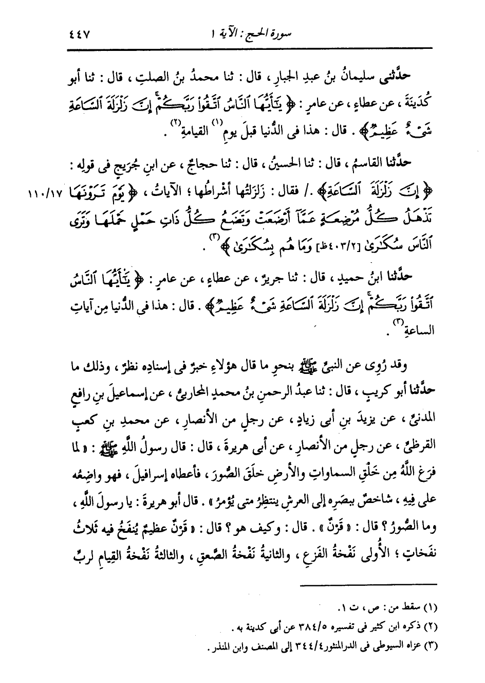 حَدَّثَنِي سُلَيْمَانُ بْنُ عَبْدِ الْجَبَّارِ، قَالَ: ثنا مُحَمَّدُ بْنُ الصَّلْتِ، قَالَ: ثنا أَبُو كُدَيْنَةَ، عَنْ عَطَاءٍ، عَنْ عَامِرٍ: {يَا أَيُّهَا النَّاسُ اتَّقُوا رَبَّكُمْ إِنَّ زَلْزَلَةَ السَّاعَةِ شَيْءٌ عَظِيمٌ} [الحج: 1] قَالَ: «§هَذَا فِي الدُّنْيَا قَبْلَ يَوْمِ الْقِيَامَةِ»