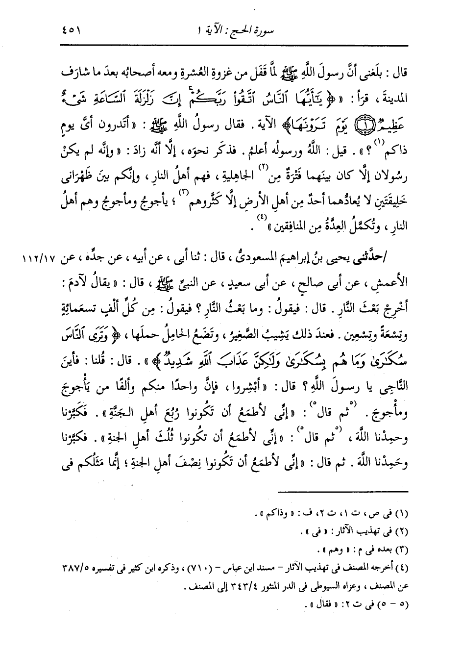حَدَّثَنِي يَحْيَى بْنُ إِبْرَاهِيمَ الْمَسْعُودِيُّ، قَالَ: ثنا أَبِي، عَنْ أَبِيهِ، عَنْ جَدِّهِ، عَنِ الْأَعْمَشِ، عَنْ أَبِي صَالِحٍ، عَنْ أَبِي سَعِيدٍ، عَنِ النَّبِيِّ صَلَّى اللهُ عَلَيْهِ وَسَلَّمَ قَالَ: " §يُقَالُ لِآدَمَ: أَخْرِجْ بَعَثَ النَّارِ قَالَ: فَيَقُولُ: وَمَا بَعْثُ النَّارِ؟ فَيَقُولُ: مِنْ كُلِّ أَلْفٍ تِسْعَ مِائَةٍ وَتِسْعَةً وَتِسْعِينَ. فَعِنْدَ ذَلِكَ يَشِيبُ الصَّغِيرُ، وَتَضَعُ الْحَامِلُ حَمْلَهَا، وَتَرَى النَّاسَ سُكَارَى وَمَا هُمْ بِسُكَارَى، وَلَكِنَّ عَذَابَ اللَّهِ شَدِيدٌ ". قَالَ: قُلْنَا فَأَيْنَ النَّاجِي يَا رَسُولَ اللَّهِ؟ قَالَ: «أَبْشِرُوا فَإِنَّ وَاحِدًا مِنْكُمْ , وَأَلْفًا مِنْ يَأْجُوجَ وَمَأْجُوجَ» . ثُمَّ قَالَ: «إِنِّي لَأَطْمَعُ أَنْ تَكُونُوا رُبُعَ أَهْلِ الْجَنَّةِ» فَكَبَّرْنَا وَحَمِدْنَا اللَّهَ. ثُمَّ قَالَ: «إِنِّي لَأَطْمَعُ أَنْ تَكُونُوا ثُلُثَ أَهْلِ الْجَنَّةِ» فَكَبَّرْنَا وَحَمِدْنَا اللَّهَ. ثُمَّ قَالَ: «إِنِّي لَأَطْمَعُ أَنْ تَكُونُوا نِصْفَ أَهْلِ الْجَنَّةِ , إِنَّمَا مَثَلُكُمْ فِي -[452]- النَّاسِ كَمَثَلِ الشَّعَرَةِ الْبَيْضَاءِ فِي الثَّوْرِ الْأَسْوَدِ، أَوْ كَمَثَلِ الشَّعَرَةِ السَّوْدَاءِ فِي الثَّوْرِ الْأَبْيَضِ» حَدَّثَنَا أَبُو السَّائِبِ قَالَ: ثنا أَبُو مُعَاوِيَةَ، عَنِ الْأَعْمَشِ، عَنْ أَبِي صَالِحٍ، عَنْ أَبِي سَعِيدٍ الْخُدْرِي قَالَ: قَالَ رَسُولُ اللَّهِ صَلَّى اللهُ عَلَيْهِ وَسَلَّمَ: «يَقُولُ اللَّهُ لِآدَمَ يَوْمَ الْقِيَامَةِ» . ثُمَّ ذَكَرَ نَحْوَهُ