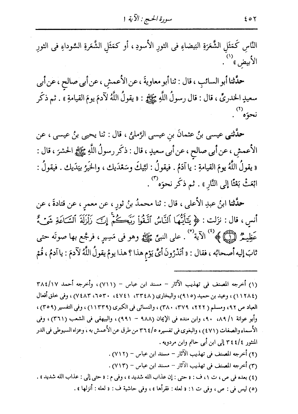 حَدَّثَنَا ابْنُ عَبْدِ الْأَعْلَى، قَالَ: ثنا مُحَمَّدُ بْنُ ثَوْرٍ، عَنْ مَعْمَرٍ، عَنْ قَتَادَةَ، عَنْ أَنَسٍ، قَالَ: نَزَلَتْ {يَا أَيُّهَا النَّاسُ اتَّقُوا رَبَّكُمْ إِنَّ زَلْزَلَةَ السَّاعَةِ شَيْءٌ عَظِيمٌ} [الحج: 1] حَتَّى إِلَى: {عَذَابَ اللَّهِ شَدِيدٌ} [الحج: 2] الْآيَةُ , عَلَى النَّبِيِّ صَلَّى اللهُ عَلَيْهِ وَسَلَّمَ وَهُوَ فِي مَسِيرٍ، فَرَجَّعَ بِهَا صَوْتَهُ، حَتَّى ثَابَ إِلَيْهِ أَصْحَابُهُ، فَقَالَ: " §أَتَدْرُونَ أَيَّ يَوْمٍ هَذَا؟ هَذَا يَوْمَ يَقُولُ اللَّهُ لِآدَمَ: يَا آدَمُ , قُمْ -[453]- فَابْعَثْ بَعْثَ النَّارِ مِنْ كُلِّ أَلْفٍ تِسْعَ مِائَةٍ وَتِسْعَةً وَتِسْعِينَ " فَكَبُرَ ذَلِكَ عَلَى الْمُسْلِمِينَ، فَقَالَ النَّبِيُّ صَلَّى اللهُ عَلَيْهِ وَسَلَّمَ: " سَدِّدُوا وَقَارِبُوا وَأَبْشِرُوا فَوَالَّذِي نَفْسِي بِيَدِهِ مَا أَنْتُمْ فِي النَّاسِ إِلَّا كَالشَّامَةِ فِي جَنْبِ الْبَعِيرِ، أَوْ كَالرَّقْمَةِ فِي ذِرَاعِ الدَّابَّةِ، وَإِنَّ مَعَكُمْ لَخَلِيقَتَيْنِ مَا كَانَتَا فِي شَيْءٍ قَطُّ إِلَّا كَثَّرَتَاهُ: يَأْجُوجُ وَمَأْجُوجُ، وَمَنْ هَلَكَ مِنْ كَفَرَةِ الْجِنِّ وَالْإِنْسِ "