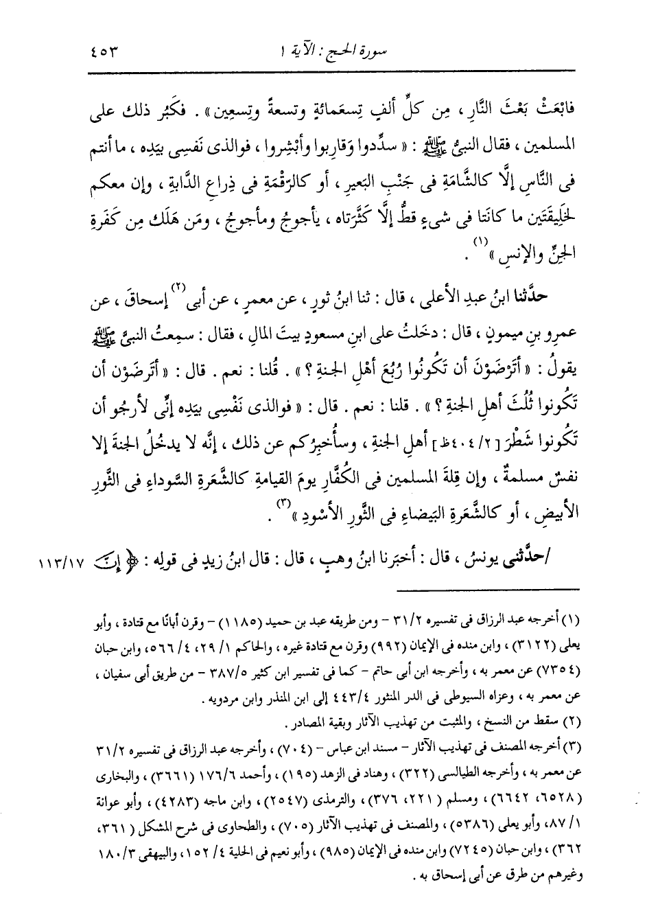 حَدَّثَنَا ابْنُ عَبْدِ الْأَعْلَى، قَالَ ثنا ابْنُ ثَوْرٍ، عَنْ مَعْمَرٍ، عَنْ إِسْحَاقَ، عَنْ عَمْرِو بْنِ مَيْمُونٍ، قَالَ: دَخَلْتُ عَلَى ابْنِ مَسْعُودٍ بَيْتِ الْمَالِ، فَقَالَ: سَمِعْتُ النَّبِيَّ صَلَّى اللهُ عَلَيْهِ وَسَلَّمَ يَقُولُ: «§أَتَرْضَوْنَ أَنْ تَكُونُوا رُبُعَ أَهْلِ الْجَنَّةِ؟» قُلْنَا نَعَمْ , قَالَ: «أَتَرْضَوْنَ أَنْ تَكُونُوا ثُلُثَ أَهْلِ الْجَنَّةِ؟» قُلْنَا: نَعَمْ , قَالَ: «فَوَالَّذِي نَفْسِي بِيَدِهِ، إِنِّي لَأَرْجُو أَنْ تَكُونُوا شَطْرَ أَهْلِ الْجَنَّةِ، وَسَأُخْبِرُكُمْ عَنْ ذَلِكَ , إِنَّهُ لَا يَدْخُلُ الْجَنَّةَ إِلَّا نَفْسٌ مُسْلِمَةٌ، وَإِنَّ قِلَّةَ الْمُسْلِمِينَ فِي الْكُفَّارِ يَوْمَ الْقِيَامَةِ كَالشَّعْرَةِ السَّوْدَاءِ فِي الثَّوْرِ الْأَبْيَضِ، أَوْ كَالشَّعْرَةِ الْبَيْضَاءِ فِي الثَّوْرِ الْأَسْوَدِ»