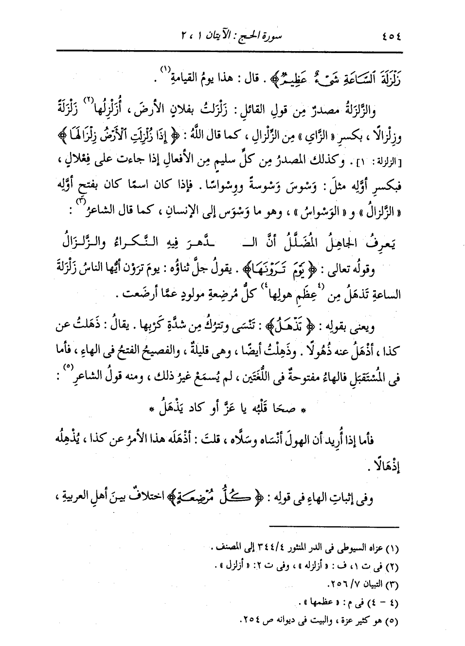 §وَقَوْلُهُ تَعَالَى: {يَوْمَ تَرَوْنَهَا} [الحج: 2] يَقُولُ جَلَّ ثَنَاؤُهُ: يَوْمَ تَرَوْنَ أَيُّهَا النَّاسُ زَلْزَلَةَ السَّاعَةِ تُذْهِلُ مِنْ عِظَمِهَا كُلَّ مُرْضِعَةِ مَوْلُودٍ عَمَّا أَرْضَعَتْ. وَيَعْنِي بِقَوْلِهِ: {تَذْهَلُ} [الحج: 2] تَنْسَى وَتَتْرُكَ مِنْ شِدَّةِ كَرْبِهَا، يُقَالُ: ذَهَلْتُ عَنْ كَذَا أَذْهَلُ عَنْهُ ذُهُولًا وَذَهِلْتُ أَيْضًا، وَهِيَ قَلِيلَةٌ، وَالْفَصِيحُ: الْفَتْحُ فِي الْهَاءِ، فَأَمَّا فِي الْمُسْتَقْبَلِ فَالْهَاءُ مَفْتُوحَةٌ فِي اللُّغَتَيْنِ، لَمْ يُسْمَعْ غَيْرُ ذَلِكَ , وَمِنْهُ قَوْلُ الشَّاعِرِ: