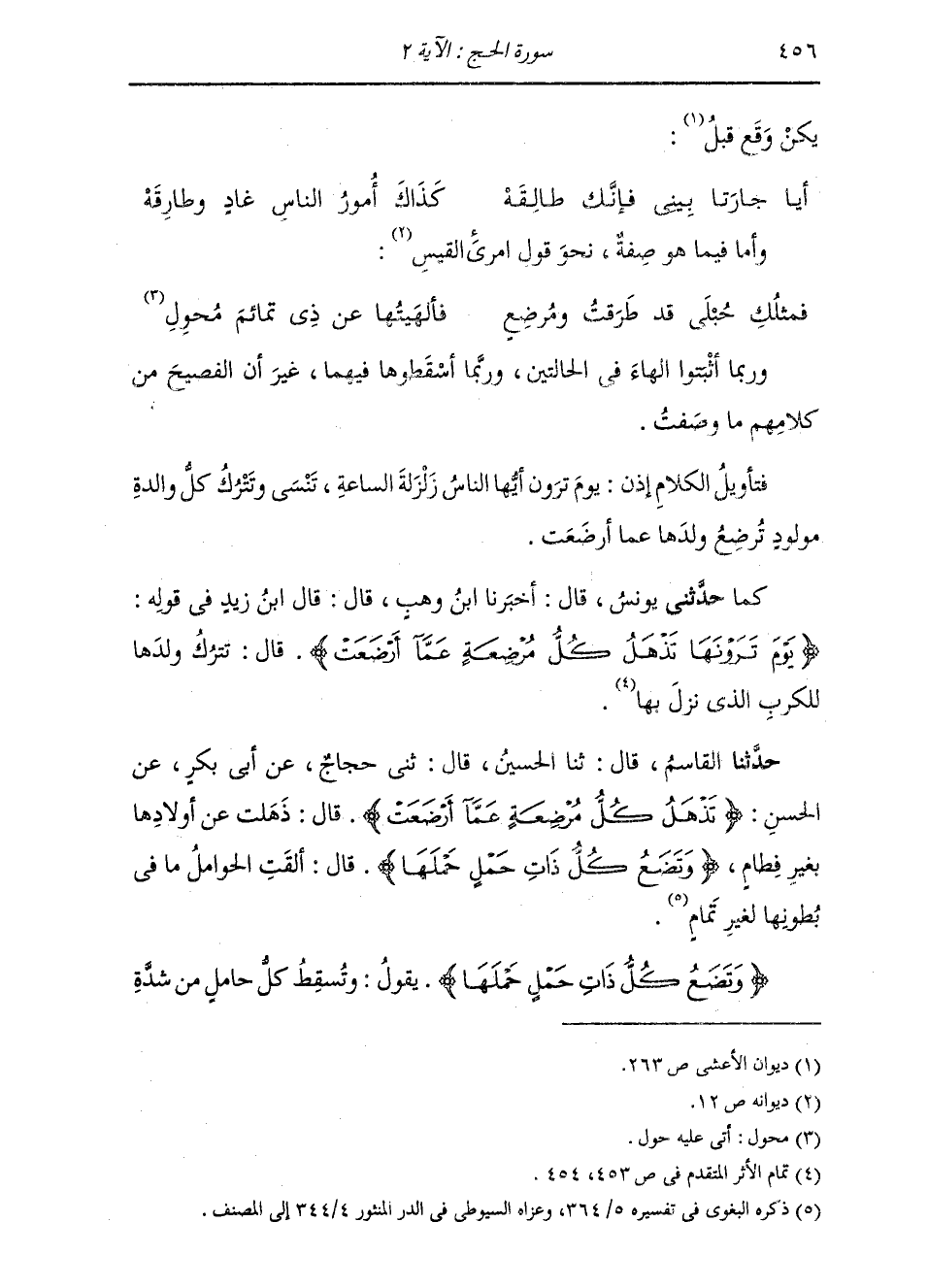 وَرُبَّمَا أَثْبَتُوا الْهَاءَ فِي الْحَالَتَيْنِ , وَرُبَّمَا أَسْقَطُوهُمَا فِيهِمَا , غَيْرَ أَنَّ الْفَصِيحَ مِنْ كَلَامِهِمْ مَا وَصَفْتُ. فَتَأْوِيلُ الْكَلَامِ إِذَنْ: يَوْمَ تَرَوْنَ أَيُّهَا النَّاسُ زَلْزَلَةَ السَّاعَةِ، تَنْسَى وَتَتْرُكَ كُلُّ وَالِدَةِ مَوْلُودٍ تُرْضِعُ وَلَدَهَا عَمَّا أَرْضَعَتْ