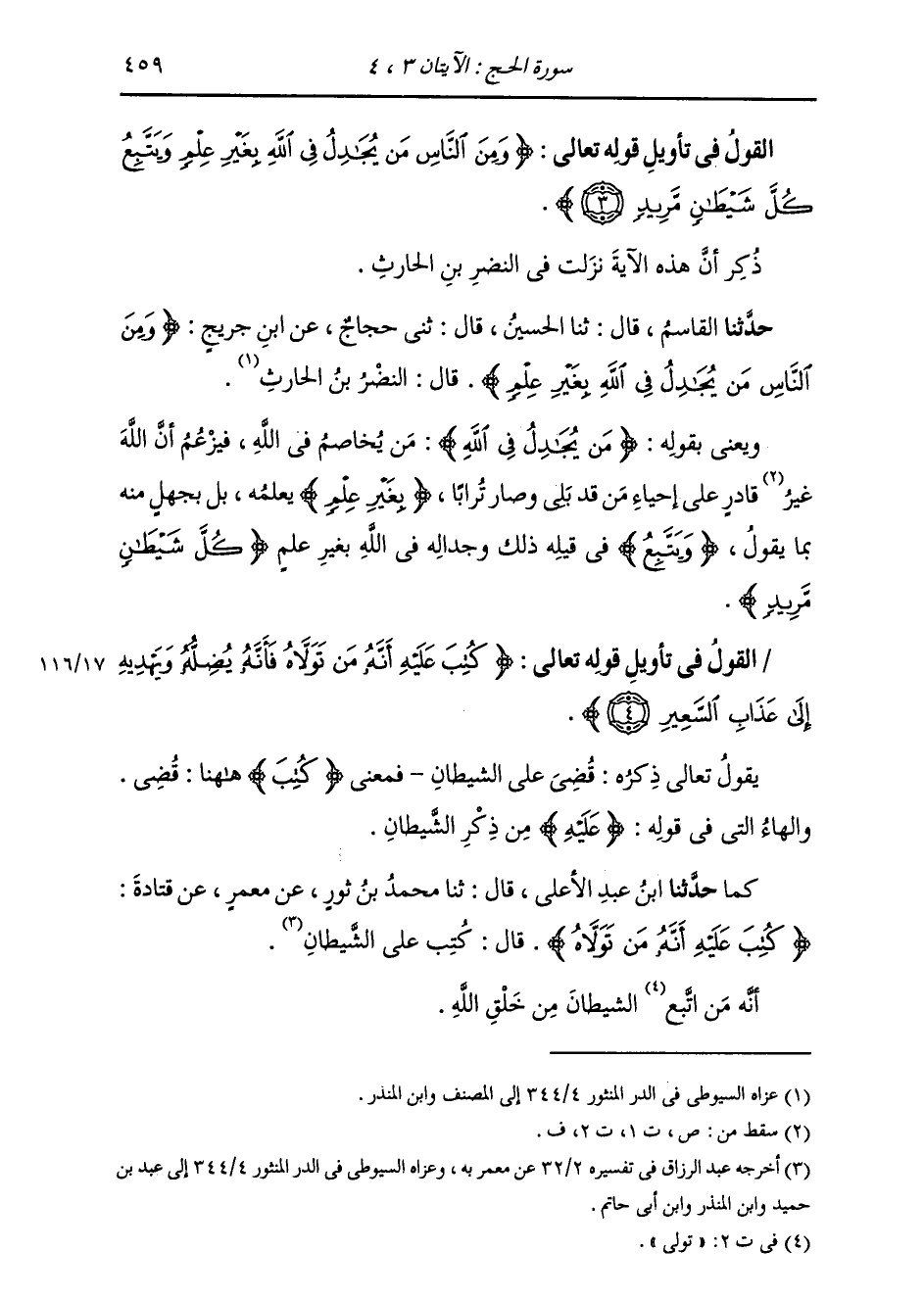 §الْقَوْلُ فِي تَأْوِيلِ قَوْلِهِ تَعَالَى: {وَمَنِ النَّاسِ مَنْ يُجَادِلُ فِي اللَّهِ بِغَيْرِ عِلْمٍ وَيَتَّبِعُ كُلَّ شَيْطَانٍ مَرِيدٍ} [الحج: 3] ذُكِرَ أَنَّ هَذِهِ الْآيَةَ نَزَلَتْ فِي النَّضْرِ بْنِ الْحَارِثِ