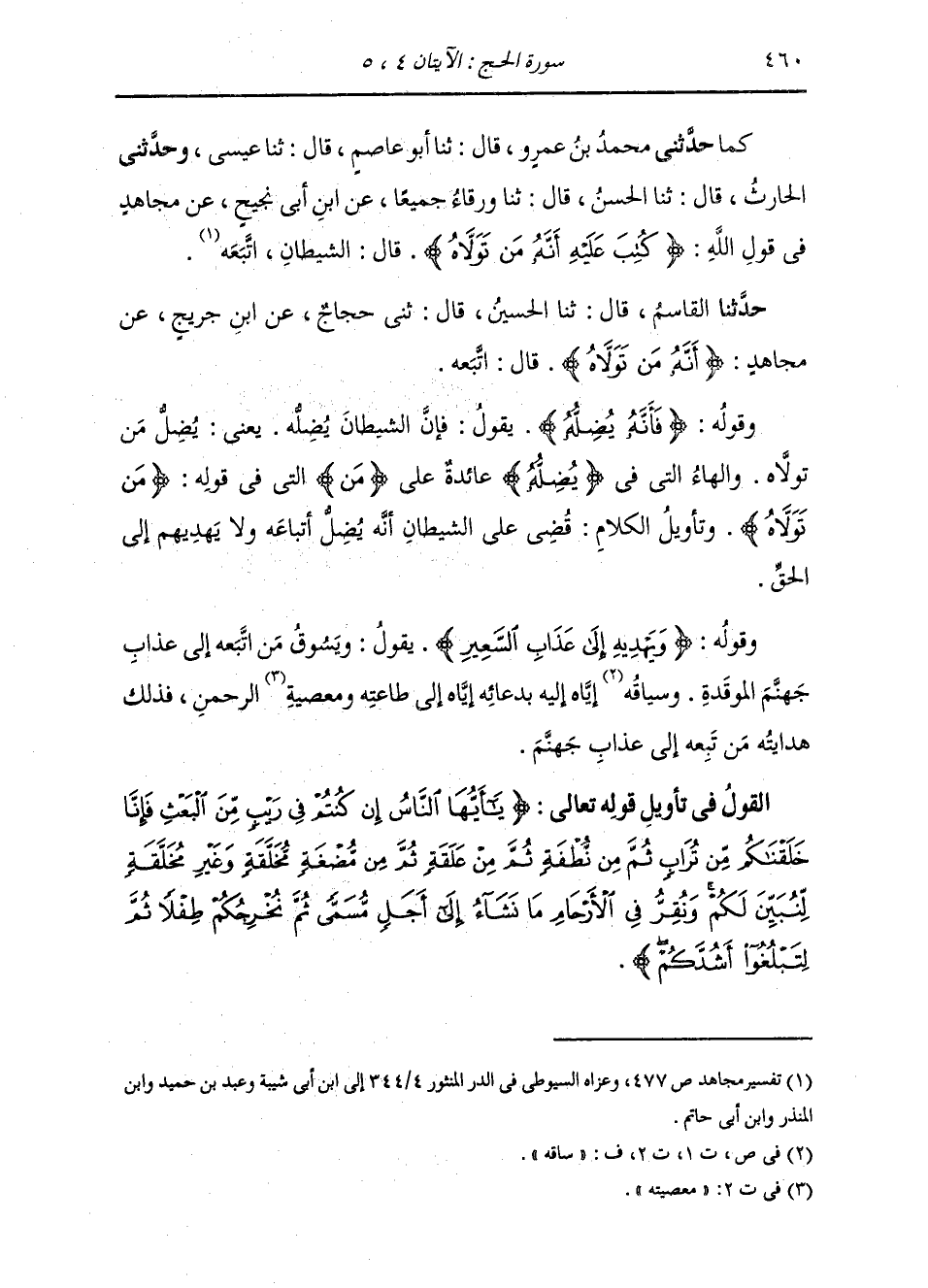 حَدَّثَنَا الْقَاسِمُ قَالَ: ثنا الْحُسَيْنُ قَالَ: ثني حَجَّاجٌ، عَنِ ابْنِ جُرَيْجٍ، عَنْ مُجَاهِدٍ {أَنَّهُ مَنْ تَوَلَّاهُ} [الحج: 4] قَالَ: " §اتَّبَعَهُ. وَقَوْلُهُ: {فَأَنَّهُ يُضِلُّهُ} [الحج: 4] يَقُولُ: فَإِنَّ الشَّيْطَانَ يُضِلُّهُ، يَعْنِي: يُضِلُّ مَنْ تَوَلَّاهُ. وَالْهَاءُ الَّتِي فِي {يُضِلُّهُ} [الأنعام: 125] عَائِدَةٌ عَلَى {مَنْ} [الحج: 4] الَّتِي فِي قَوْلِهِ: {مَنْ تَوَلَّاهُ} [الحج: 4] وَتَأْوِيلُ الْكَلَامِ: قُضِيَ عَلَى الشَّيْطَانِ أَنَّهُ يُضِلُّ أَتْبَاعَهُ وَلَا يَهْدِيهِمْ إِلَى الْحَقِّ. وَقَوْلُهُ: {وَيَهْدِيهِ إِلَى عَذَابِ السَّعِيرِ} [الحج: 4] يَقُولُ: وَيَسُوقُ مَنِ اتَّبَعَهُ إِلَى عَذَابِ جَهَنَّمَ الْمُوقَدَةِ , وَسِيَاقُهُ إِيَّاهُ إِلَيْهِ بِدُعَائِهِ إِلَى طَاعَتِهِ , وَمَعْصِيَةِ الرَّحْمَنِ، فَذَلِكَ هِدَايَتُهُ مَنْ تَبِعَهُ إِلَى عَذَابِ جَهَنَّمَ "