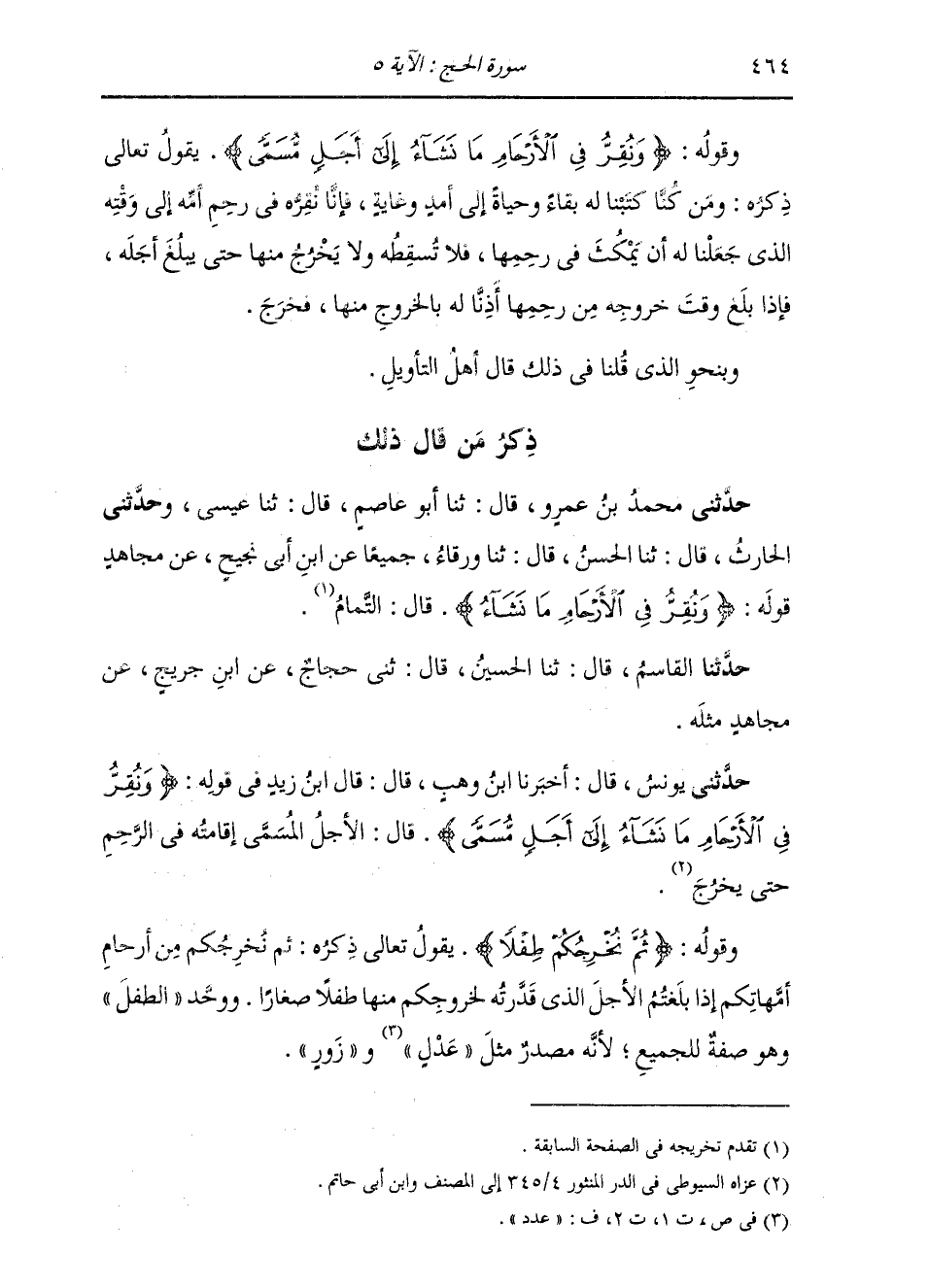 ذِكْرُ مَنْ قَالَ ذَلِكَ: حَدَّثَنِي مُحَمَّدُ بْنُ عَمْرٍو، قَالَ: ثنا أَبُو عَاصِمٍ، قَالَ: ثنا عِيسَى، وَحَدَّثَنِي الْحَارِثُ، قَالَ: ثنا الْحَسَنُ، قَالَ: ثنا وَرْقَاءُ، جَمِيعًا، عَنِ ابْنِ أَبِي نَجِيحٍ، عَنْ مُجَاهِدٍ، قَوْلُهُ: {وَنُقِرُّ فِي الْأَرْحَامِ مَا نَشَاءُ إِلَى أَجْلٍ مُسَمًّى} [الحج: 5] قَالَ: «§التَّمَامُ» حَدَّثَنَا الْقَاسِمُ قَالَ: ثنا الْحُسَيْنُ قَالَ: ثني حَجَّاجٌ، عَنِ ابْنِ جُرَيْجٍ، عَنْ مُجَاهِدٍ، مِثْلَهُ