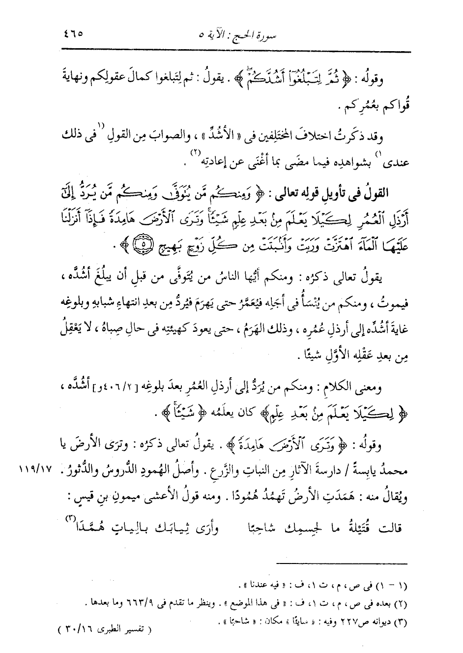 §الْقَوْلُ فِي تَأْوِيلِ قَوْلِهِ تَعَالَى: {وَمِنْكُمْ مَنْ يُتَوَفَّى وَمِنْكُمْ مِنْ يُرَدُّ إِلَى أَرْذَلِ الْعُمُرِ لِكَيْلَا يَعْلَمَ مِنْ بَعْدِ عِلْمٍ شَيْئًا وَتَرَى الْأَرْضَ هَامِدَةً فَإِذَا أَنزَلْنَا عَلَيْهَا الْمَاءَ اهْتَزَّتْ وَرَبَتْ وَأَنبَتَتْ مِنْ كُلِّ زَوْجٍ بَهِيجٍ} [الحج: 5] يَقُولُ تَعَالَى ذِكْرُهُ: وَمِنْكُمْ أَيُّهَا النَّاسُ مَنْ يُتَوَفَّى قَبْلَ أَنْ يَبْلُغَ أَشُدَّهُ فَيَمُوتُ، وَمِنْكُمْ مَنْ يُنْسَأُ فِي أَجَلِهِ فَيُعَمِّرُ حَتَّى يَهْرَمَ , فَيُرَدَّ مِنْ بَعْدِ انْتِهَاءِ شَبَابِهِ , وَبُلُوغِهِ غَايَةَ أَشُدِّهِ إِلَى أَرْذَلِ عُمْرِهِ، وَذَلِكَ الْهَرَمُ، حَتَّى يَعُودَ كَهَيْئَتِهِ فِي حَالِ صِبَاهُ لَا يَعْقِلُ مِنْ بَعْدِ عَقْلِهِ الْأَوَّلِ شَيْئًا. وَمَعْنَى الْكَلَامِ: وَمِنْكُمْ مَنْ يُرَدُّ إِلَى أَرْذَلِ الْعُمُرِ بَعْدَ بُلُوغِهِ أَشُدَّهُ {لِكَيْلَا يَعْلَمَ مِنْ بَعْدِ عِلْمٍ} [الحج: 5] كَانَ يَعْلَمُهُ {شَيْئًا} [البقرة: 48]