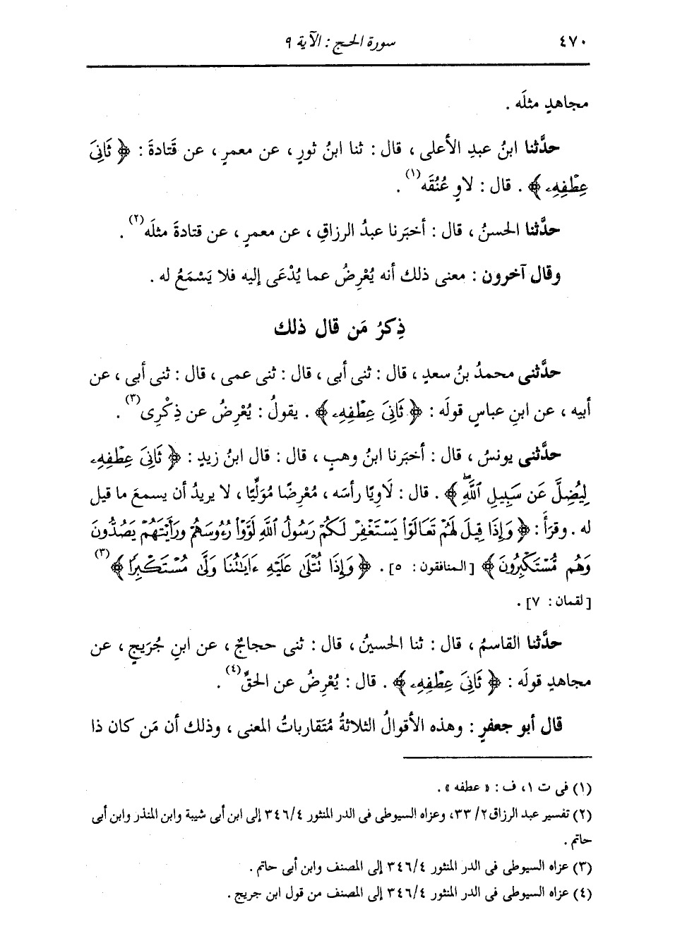 حَدَّثَنَا ابْنُ عَبْدِ الْأَعْلَى، قَالَ: ثنا ابْنُ ثَوْرٍ، عَنْ مَعْمَرٍ، عَنْ قَتَادَةَ: {ثَانِيَ عِطْفِهِ} [الحج: 9] قَالَ: «§لَاو عُنُقَهُ» حَدَّثَنَا الْحَسَنُ قَالَ: أَخْبَرَنَا عَبْدُ الرَّزَّاقِ، عَنْ مَعْمَرٍ، عَنْ قَتَادَةَ، مِثْلَهُ وَقَالَ آخَرُونَ: مَعْنَى ذَلِكَ أَنَّهُ يُعْرِضُ عَمَّا يُدْعَى إِلَيْهِ , فَلَا يَسْمَعُ لَهُ