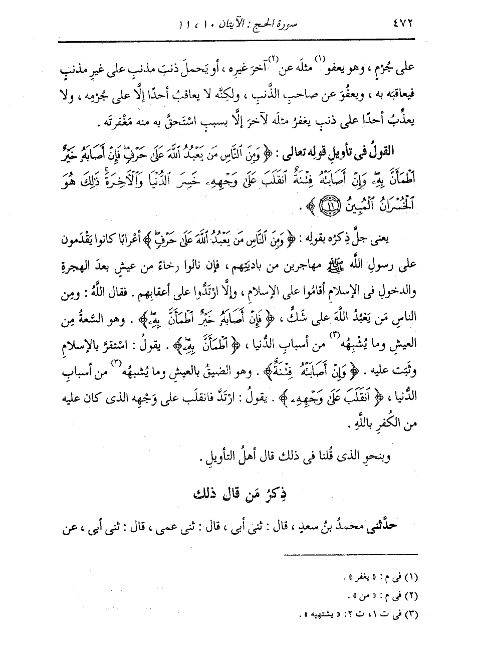 §الْقَوْلُ فِي تَأْوِيلِ قَوْلِهِ تَعَالَى: {وَمِنَ النَّاسِ مَنْ يَعْبُدُ اللَّهَ عَلَى حَرْفٍ فَإِنْ أَصَابَهُ خَيْرٌ اطْمَأَنَّ بِهِ وَإِنْ أَصَابَتْهُ فِتْنَةٌ انْقَلَبَ عَلَى وَجْهِهِ خَسِرَ الدُّنْيَا وَالْآخِرَةَ ذَلِكَ هُوَ الْخُسْرَانُ الْمُبِينُ} [الحج: 11] يَعْنِي جَلَّ ذِكْرُهُ بِقَوْلِهِ: {وَمِنَ النَّاسِ مَنْ يَعْبُدُ اللَّهَ عَلَى حَرْفٍ} [الحج: 11] أَعْرَابًا كَانُوا يَقْدَمُونَ عَلَى رَسُولِ اللَّهِ صَلَّى اللهُ عَلَيْهِ وَسَلَّمَ، مُهَاجِرِينَ مِنْ بَادِيَتِهِمْ، فَإِنْ نَالُوا رَخَاءً مِنْ عَيْشٍ بَعْدَ الْهِجْرَةِ , وَالدُّخُولِ فِي الْإِسْلَامِ أَقَامُوا عَلَى الْإِسْلَامِ، وَإِلَّا ارْتَدُّوا عَلَى أَعْقَابِهِمْ , فَقَالَ اللَّهُ: {وَمِنَ النَّاسِ مَنْ يَعْبُدُ اللَّهَ} [الحج: 11] عَلَى شَكٍّ، {فَإِنْ أَصَابَهُ خَيْرٌ اطْمَأَنَّ بِهِ} [الحج: 11] وَهُوَ السَّعَةُ مِنَ الْعَيْشِ وَمَا يُشْبِهُهُ مِنْ أَسْبَابِ الدُّنْيَا {اطْمَأَنَّ بِهِ} [الحج: 11] يَقُولُ: اسْتَقَرَّ بِالْإِسْلَامِ , وَثَبَتَ عَلَيْهِ. {وَإِنْ أَصَابَتْهُ فِتْنَةٌ} [الحج: 11] وَهُوَ الضِّيقُ بِالْعَيْشِ وَمَا يُشْبِهُهُ مِنْ أَسْبَابِ الدُّنْيَا {انْقَلَبَ عَلَى وَجْهِهِ} [الحج: 11] يَقُولُ: ارْتَدَّ فَانْقَلَبَ عَلَى وَجْهِهِ الَّذِي كَانَ عَلَيْهِ مِنَ الْكُفْرِ بِاللَّهِ. وَبِنَحْوِ الَّذِي قُلْنَا فِي ذَلِكَ قَالَ أَهْلُ التَّأْوِيلِ