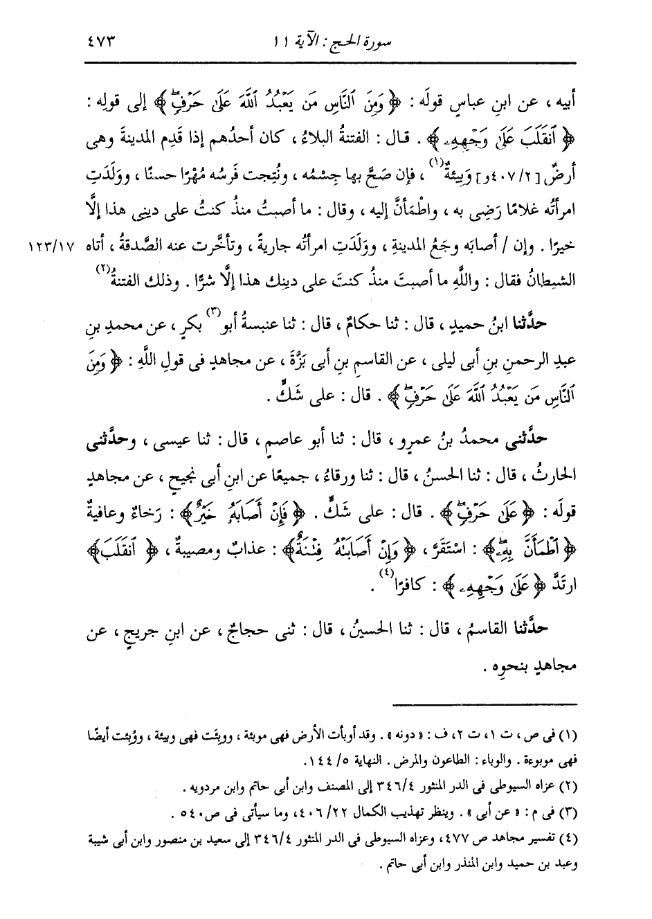حَدَّثَنِي مُحَمَّدُ بْنُ عَمْرٍو، قَالَ: ثنا أَبُو عَاصِمٍ، قَالَ: ثنا عِيسَى، وَحَدَّثَنِي الْحَارِثُ، قَالَ: ثنا الْحَسَنُ، قَالَ: ثنا وَرْقَاءُ، جَمِيعًا، عَنِ ابْنِ أَبِي نَجِيحٍ، عَنْ مُجَاهِدٍ، قَوْلُهُ: {عَلَى حَرْفٍ} [الحج: 11] قَالَ: " §عَلَى شَكٍّ. {فَإِنْ أَصَابَهُ خَيْرٌ} [الحج: 11] رَخَاءٌ وَعَافِيَةٌ {اطْمَأَنَّ بِهِ} [الحج: 11] اسْتَقَرَّ. {وَإِنْ أَصَابَتْهُ فِتْنَةٌ} [الحج: 11] عَذَابٌ وَمُصِيبَةٌ {انْقَلَبَ} [الحج: 11] ارْتَدَّ {عَلَى وَجْهِهِ} [الحج: 11] كَافِرًا " حَدَّثَنَا الْقَاسِمُ قَالَ: ثنا الْحُسَيْنُ قَالَ: ثني حَجَّاجٌ، عَنِ ابْنِ جُرَيْجٍ، عَنْ مُجَاهِدٍ، بِنَحْوِهِ -[474]- قَالَ ابْنُ جُرَيْجٍ: كَانَ نَاسٌ مِنْ قَبَائِلِ الْعَرَبِ وَمِمَّنْ حَوْلَهُمْ مِنْ أَهْلِ الْقُرَى يَقُولُونَ: نَأْتِي مُحَمَّدًا صَلَّى اللهُ عَلَيْهِ وَسَلَّمَ، فَإِنْ صَادَفْنَا خَيْرًا مِنْ مَعِيشَةِ الرِّزْقِ , ثَبَتْنَا مَعَهُ، وَإِلَّا لَحِقَنَا بِأَهْلِنَا