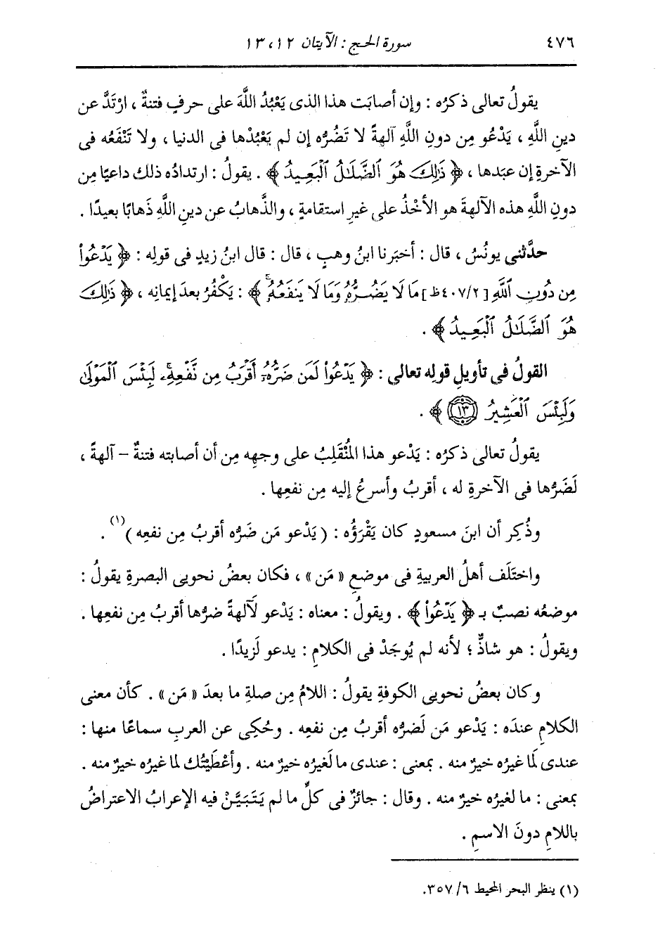 §الْقَوْلُ فِي تَأْوِيلِ قَوْلِهِ تَعَالَى: {يَدْعُو لَمَنْ ضَرُّهُ أَقْرَبُ مِنْ نَفْعِهِ لَبِئْسَ الْمَوْلَى وَلَبِئْسَ الْعَشِيرُ} [الحج: 13] يَقُولُ تَعَالَى ذِكْرُهُ: يَدْعُو هَذَا الْمُنْقَلَبُ عَلَى وَجْهِهِ مِنْ أَنْ أَصَابَتْهُ فِتْنَةٌ آلِهَةً لَضَرُّهَا فِي الْآخِرَةِ لَهُ، أَقْرَبُ وَأَسْرَعُ إِلَيْهِ مِنْ نَفْعِهَا. وَذُكِرَ أَنَّ ابْنَ مَسْعُودٍ كَانَ يَقْرَؤُهُ: «يَدْعُو مَنْ ضَرُّهُ أَقْرَبُ مِنْ نَفْعِهِ» وَاخْتَلَفَ أَهْلُ الْعَرَبِيَّةِ فِي مَوْضِعِ {مَنْ} [البقرة: 4] ، فَكَانَ بَعْضُ نَحْوِيِّي الْبَصْرَةِ يَقُولُ: مَوْضِعُهُ نَصْبٌ بِـ {يَدْعُو} [البقرة: 221] ، وَيَقُولُ: مَعْنَاهُ: يَدْعُو لَآلِهَةٌ ضَرُّهَا أَقْرَبُ مِنْ نَفْعِهَا، وَيَقُولُ: هُوَ شَاذُّ لِأَنَّهُ لَمْ يُوجَدْ فِي الْكَلَامِ: يَدْعُو لَزَيْدًا. وَكَانَ بَعْضُ نَحْوِيِّي الْكُوفَةِ يَقُولُ: اللَّامُ مِنْ صِلَةِ مَا بَعْدَ {مَنْ} [البقرة: 4] ، كَأَنَّ مَعْنَى الْكَلَامِ عِنْدَهُ: يَدْعُو مَنْ لَضَرُّهُ أَقْرَبُ مِنْ نَفْعِهِ. وَحُكِيَ عَنِ الْعَرَبِ سَمَاعًا مِنْهَا: عِنْدِي لَمَا غَيْرُهُ خَيْرٌ مِنْهُ، بِمَعْنَى: عِنْدِي مَا لَغَيْرُهُ خَيْرٌ مِنْهُ , وَأَعْطَيْتُكَ لَمَا غَيْرُهُ خَيْرٌ مِنْهُ، بِمَعْنَى: مَا لَغَيْرُهُ خَيْرٌ مِنْهُ. وَقَالَ: جَائِزٌ فِي كُلِّ مَا لَمْ يَتَبَيَّنْ فِيهِ الْإِعْرَابُ الِاعْتِرَاضُ بِاللَّامِ دُونَ الِاسْمِ.