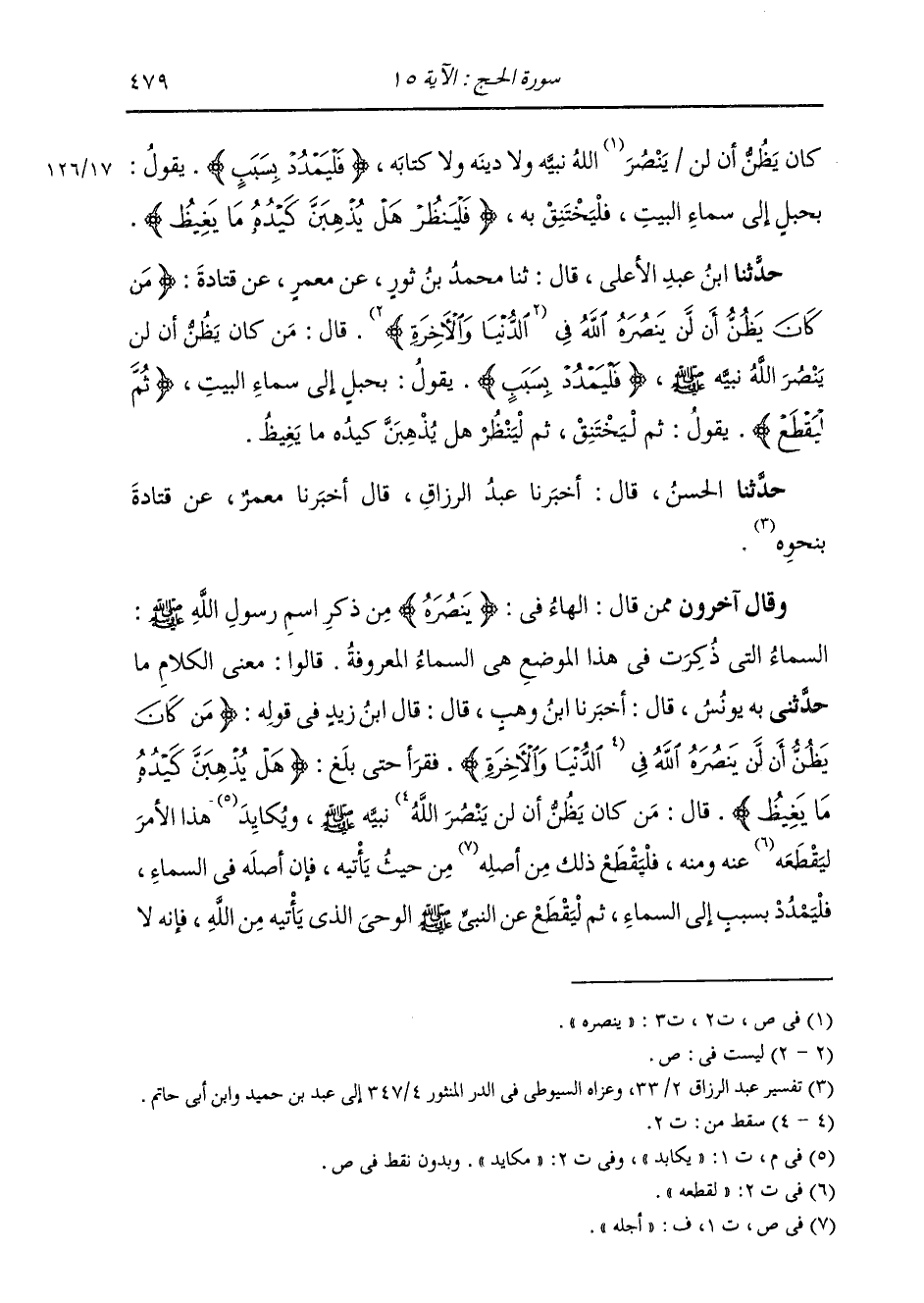حَدَّثَنَا ابْنُ عَبْدِ الْأَعْلَى قَالَ: ثنا مُحَمَّدُ بْنُ ثَوْرٍ، عَنْ مَعْمَرٍ، عَنْ قَتَادَةَ: {مَنْ كَانَ يَظُنُّ أَنْ لَنْ يَنْصُرَهُ اللَّهُ فِي الدُّنْيَا وَالْآخِرَةِ} [الحج: 15] قَالَ: " §مَنْ كَانَ يَظُنُّ أَنْ لَنْ يَنْصُرَ اللَّهُ نَبِيَّهُ صَلَّى اللهُ عَلَيْهِ وَسَلَّمَ، {فَلْيَمْدُدْ بِسَبَبٍ} [الحج: 15] يَقُولُ: بِحَبْلٍ إِلَى سَمَاءِ الْبَيْتِ، {ثُمَّ لِيَقْطَعْ} [الحج: 15] يَقُولُ: ثُمَّ لِيَخْتَنِقْ , ثُمَّ لَيَنْظُرْ: هَلْ يُذْهِبَنَّ كَيْدُهُ مَا يَغِيظُ " حَدَّثَنَا الْحَسَنُ قَالَ: أَخْبَرَنَا عَبْدُ الرَّزَّاقِ قَالَ: أَخْبَرَنَا مَعْمَرٌ، عَنْ قَتَادَةَ، بِنَحْوِهِ وَقَالَ آخَرُونَ مَنْ قَالَ الْهَاءُ فِي {يَنْصُرَهُ} [الحج: 15] مِنْ ذِكْرِ اسْمِ رَسُولِ اللَّهِ صَلَّى اللهُ عَلَيْهِ وَسَلَّمَ , وَالسَّمَاءُ الَّتِي ذُكِرَتْ فِي هَذَا الْمَوْضِعِ هِيَ السَّمَاءُ الْمَعْرُوفَةُ. قَالُوا: مَعْنَى الْكَلَامِ مَا
