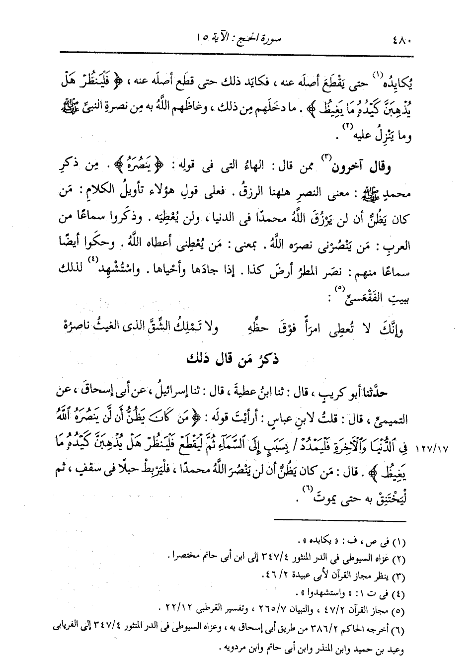 ذِكْرُ مَنْ قَالَ ذَلِكَ: حَدَّثَنِي أَبُو كُرَيْبٍ، قَالَ: ثنا ابْنُ عَطِيَّةَ، قَالَ: ثنا إِسْرَائِيلُ، عَنْ أَبِي إِسْحَاقَ، عَنِ التَّمِيمِيِّ، قَالَ: قُلْتُ لِابْنِ عَبَّاسٍ: أَرَأَيْتَ قَوْلَهُ: {مَنْ كَانَ يَظُنُّ أَنْ لَنْ يَنْصُرَهُ اللَّهُ فِي الدُّنْيَا وَالْآخِرَةِ فَلْيَمْدُدْ بِسَبَبٍ إِلَى السَّمَاءِ ثُمَّ لِيَقْطَعْ فَلْيَنْظُرْ هَلْ يُذْهِبَنَّ كَيْدُهُ مَا يَغِيظُ} [الحج: 15] قَالَ: «§مَنْ كَانَ يَظُنُّ أَنْ لَنْ يَنْصُرَ اللَّهُ مُحَمَّدًا، فَلْيَرْبِطْ حَبْلًا فِي سَقْفٍ , ثُمَّ لِيَخْتَنِقْ بِهِ حَتَّى يَمُوتَ»