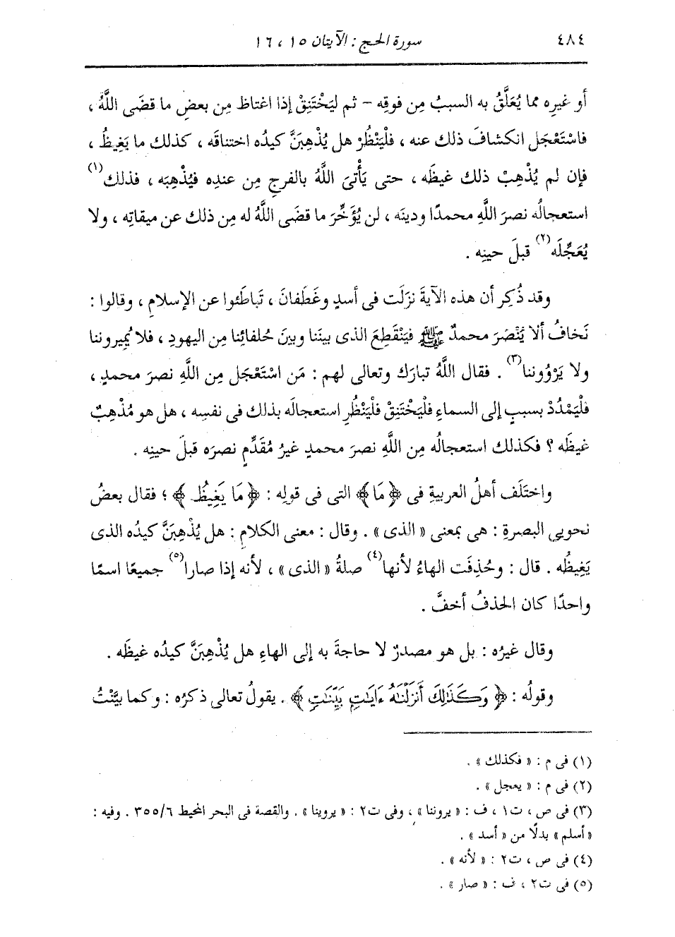 أَوْ غَيْرِهِ , مِمَّا يُعَلَّقُ بِهِ السَّبَبُ مِنْ فَوْقِهِ، ثُمَّ يَخْتَنِقْ إِذَا اغْتَاظَ مِنْ بَعْضِ مَا قَضَى اللَّهُ فَاسْتَعْجَلَ انْكِشَافَ ذَلِكَ عَنْهُ، فَلْيَنْظُرْ: هَلْ يُذْهِبَنَّ كَيْدُهُ احْتِنَاقَهُ كَذَلِكَ مَا يَغِيظُ؟ فَإِنْ لَمْ يُذْهِبْ ذَلِكَ غَيْظَهُ، حَتَّى يَأْتِيَ اللَّهُ بِالْفَرَجِ مِنْ عِنْدِهِ فَيُذْهِبَهُ، فَكَذَلِكَ اسْتِعْجَالُهُ نَصْرَ اللَّهِ مُحَمَّدًا وَدِينَهُ لَنْ يُؤَخِّرَ مَا قَضَى اللَّهُ لَهُ مِنْ ذَلِكَ عَنْ مِيقَاتِهِ , وَلَا يُعَجِّلَ قَبْلَ حِينِهِ. وَقَدْ ذُكِرَ أَنَّ هَذِهِ الْآيَةَ نَزَلَتْ فِي أَسَدٍ وَغَطَفَانَ، تَبَاطَئُوا عَنِ الْإِسْلَامِ، وَقَالُوا: نَخَافُ أَنْ لَا يُنْصَرَ مُحَمَّدٌ صَلَّى اللهُ عَلَيْهِ وَسَلَّمَ , فَيَنْقَطِعَ الَّذِي بَيْنَنَا وَبَيْنَ حُلَفَائِنَا مِنَ الْيَهُودِ فَلَا يَمِيرُونَنَا , وَلَا يُرَوُّونَنَا فَقَالَ اللَّهُ تَبَارَكَ وَتَعَالَى لَهُمْ: مَنِ اسْتَعْجَلَ مِنَ اللَّهِ نَصْرَ مُحَمَّدٍ، فَلْيَمْدُدْ بِسَبَبٍ إِلَى السَّمَاءِ , فَلْيَخْتَنِقْ , فَلْيَنْظُرِ اسْتِعْجَالَهُ بِذَلِكَ فِي نَفْسِهِ , هَلْ هُوَ مُذْهِبٌ غَيْظَهُ؟ فَكَذَلِكَ اسْتِعْجَالُهُ مِنَ اللَّهِ نَصْرَ مُحَمَّدٍ , غَيْرَ مُقَدِّمٍ نَصْرَهُ قَبْلَ حِينِهِ. وَاخْتَلَفَ أَهْلُ الْعَرَبِيَّةِ فِي {مَا} [الحج: 15] الَّتِي فِي قَوْلِهِ: {مَا يَغِيظُ} [الحج: 15] فَقَالَ بَعْضُ نَحْوِيِّي الْبَصْرَةِ: هِيَ بِمَعْنَى: الَّذِي. وَقَالَ: مَعْنَى الْكَلَامِ: هَلْ يُذْهِبَنَّ كَيْدُهُ الَّذِي يَغِيظُهُ. قَالَ: وَحُذِفَتِ الْهَاءُ لِأَنَّهَا صِلَةُ الَّذِي، لِأَنَّهُ إِذَا صَارَا جَمِيعًا اسْمًا وَاحِدًا , كَانَ الْحَذَفُ أَخَفَّ. وَقَالَ غَيْرُهُ: بَلْ هُوَ مَصْدَرٌ لَا حَاجَةَ بِهِ إِلَى الْهَاءِ، هَلْ يُذْهِبَنَّ كَيْدُهُ غَيْظَهُ