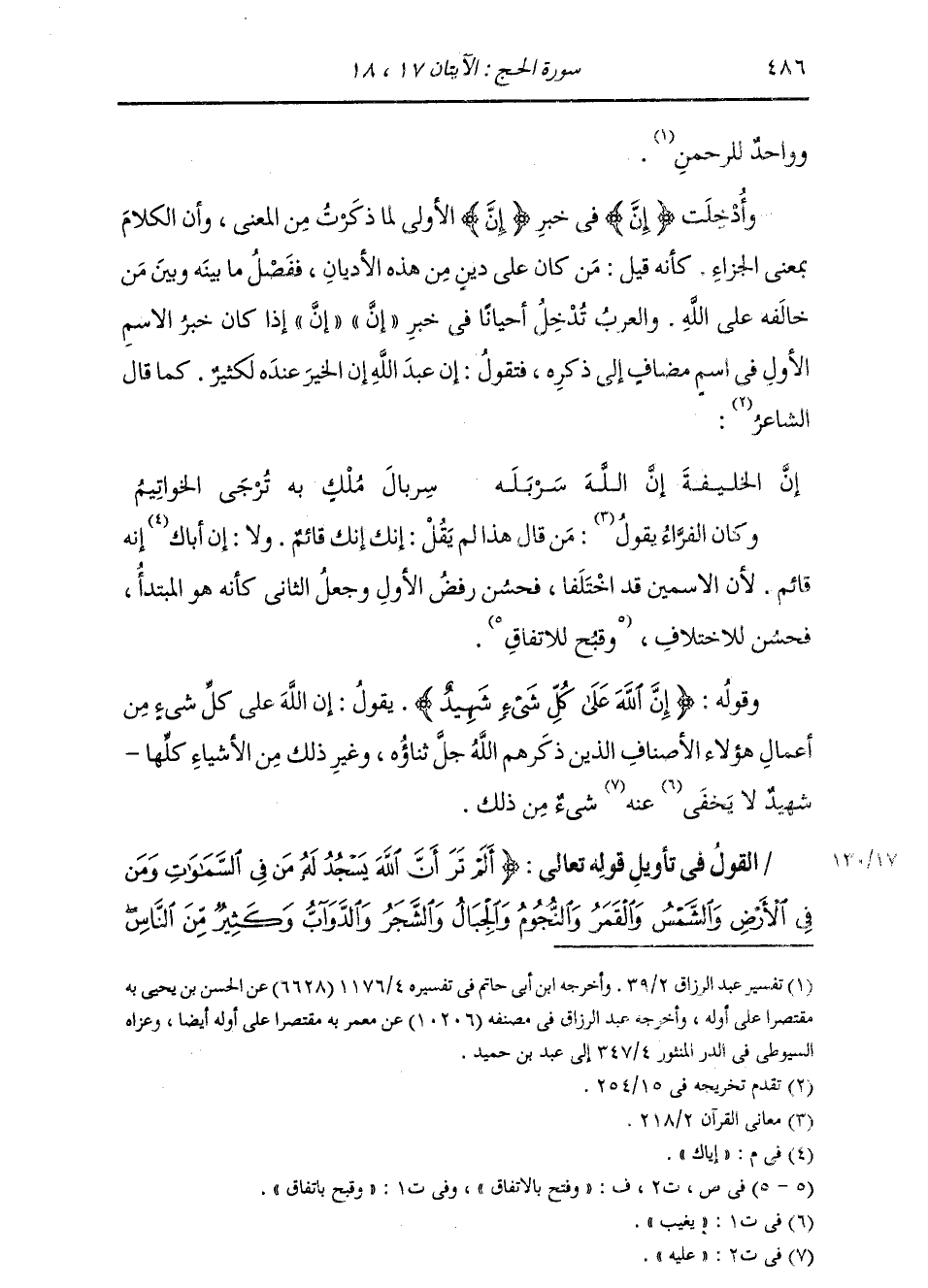 §وَقَوْلُهُ: {إِنَّ اللَّهَ عَلَى كُلِّ شَيْءٍ شَهِيدٌ} [الحج: 17] يَقُولُ: إِنَّ اللَّهَ عَلَى كُلِّ شَيْءٍ مِنْ أَعْمَالِ هَؤُلَاءِ الْأَصْنَافِ الَّذِينَ ذَكَرَهُمُ اللَّهُ جَلَّ ثَنَاؤُهُ، وَغَيْرِ ذَلِكَ مِنَ الْأَشْيَاءِ كُلِّهَا , شَهِيدٌ لَا يَخْفَى عَنْهُ شَيْءٌ مِنْ ذَلِكَ