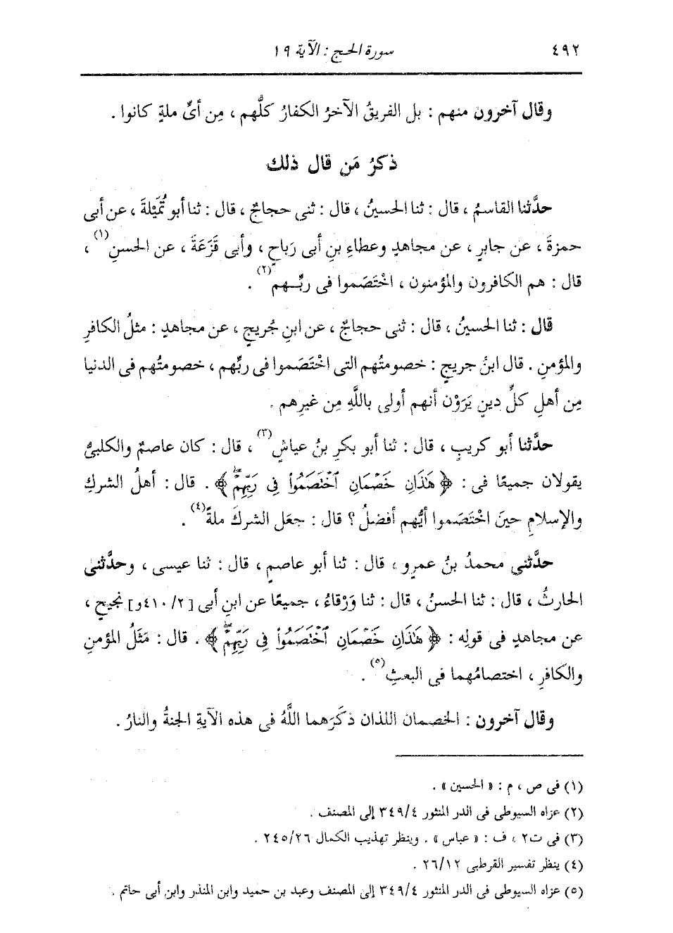 قَالَ ثنا الْحُسَيْنُ، قَالَ: ثني حَجَّاجٌ، عَنِ ابْنِ جُرَيْجٍ، عَنْ مُجَاهِدٍ: «§مَثَلُ الْكَافِرِ وَالْمُؤْمِنِ - قَالَ ابْنُ جُرَيْجٍ - خُصُومَتُهُمُ الَّتِي اخْتَصَمُوا فِي رَبِّهِمْ، خُصُومَتُهُمْ فِي الدُّنْيَا مِنْ أَهْلِ كُلِّ دِينٍ، يَرَوْنَ أَنَّهُمْ أَوْلَى بِاللَّهِ مِنْ غَيْرِهِمْ»