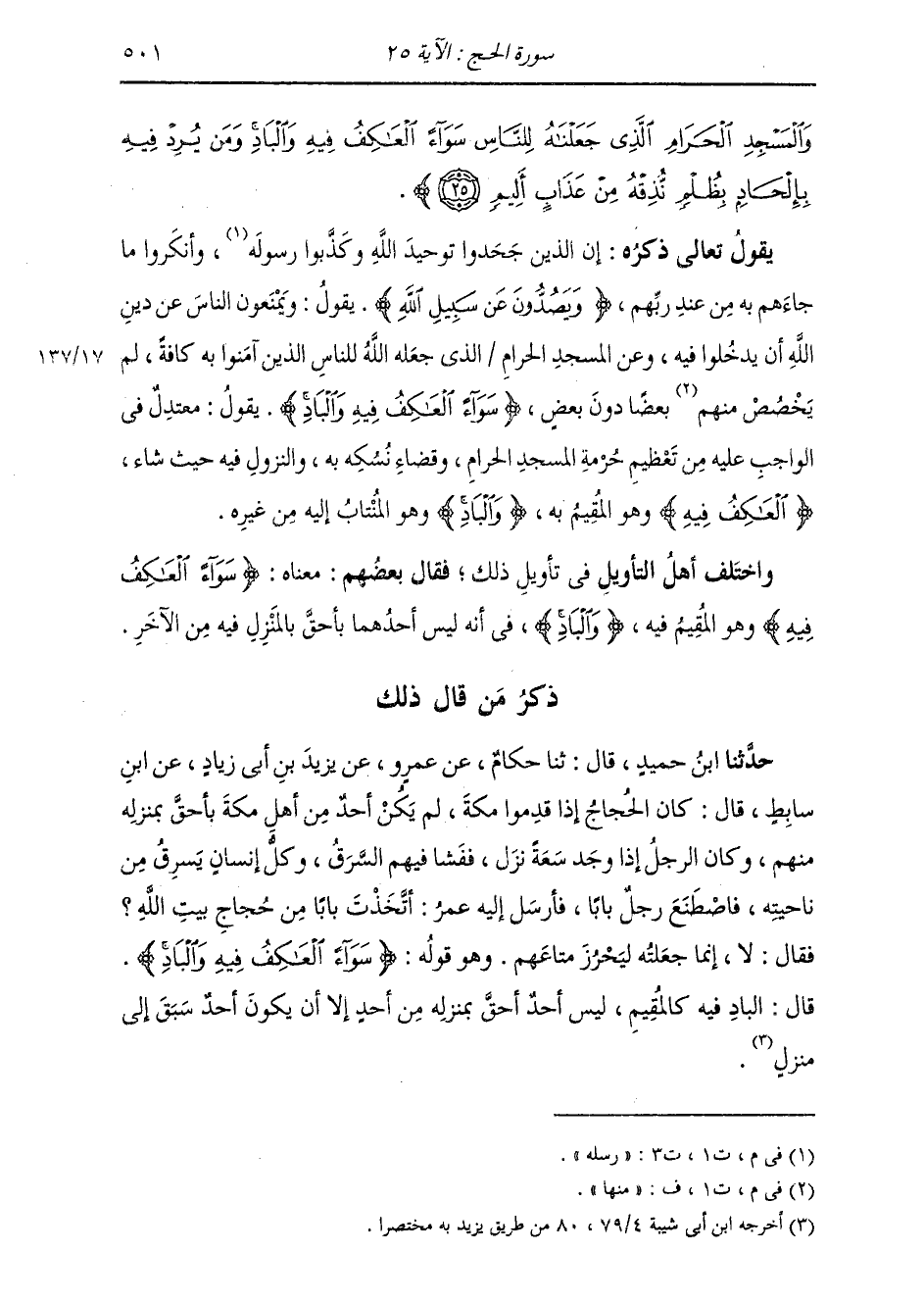وَالْمَسْجِدِ الْحَرَامِ الَّذِي جَعَلْنَاهُ لِلنَّاسِ سَوَاءً الْعَاكِفُ فِيهِ وَالْبَادِ وَمَنْ يُرِدْ فِيهِ بِإِلْحَادٍ بِظُلْمٍ نُذِقْهُ مِنْ عَذَابٍ أَلِيمٍ} [الحج: 25] يَقُولُ تَعَالَى ذِكْرُهُ: إِنَّ الَّذِينَ جَحَدُوا تَوْحِيدَ اللَّهِ , وَكَذَّبُوا رُسُلَهُ , وَأَنْكَرُوا مَا جَاءَهُمْ بِهِ مِنْ عِنْدِ رَبِّهِمْ {وَيَصُدُّونَ عَنْ سَبِيلِ اللَّهِ} [الأنفال: 47] يَقُولُ: وَيَمْنَعُونَ النَّاسَ عَنْ دِينِ اللَّهِ أَنْ يَدْخُلُوا فِيهِ، وَعَنْ الْمَسْجِدِ الْحَرَامِ الَّذِي جَعَلَهُ اللَّهُ لِلنَّاسِ الَّذِينَ آمَنُوا بِهِ كَافَّةً , لَمْ يُخَصِّصْ مِنْهَا بَعْضًا دُونَ بَعْضٍ {سَوَاءً الْعَاكِفُ فِيهِ وَالْبَادِ} [الحج: 25] يَقُولُ: مُعْتَدِلٌ فِي الْوَاجِبِ عَلَيْهِ مِنْ تَعْظِيمِ حُرْمَةِ الْمَسْجِدِ الْحَرَامِ، وَقَضَاءِ نُسُكِهِ بِهِ، وَالنُّزُولِ فِيهِ حَيْثُ شَاءَ الْعَاكِفُ فِيهِ، وَهُوَ الْمُقِيمُ بِهِ , وَالْبَادِ: وَهُوَ الْمُنْتَابُ إِلَيْهِ مِنْ غَيْرِهِ. وَاخْتَلَفَ أَهْلُ التَّأْوِيلِ فِي تَأْوِيلِ ذَلِكَ، فَقَالَ بَعْضُهُمْ: مَعْنَاهُ: سَوَاءً الْعَاكِفُ فِيهِ وَهُوَ الْمُقِيمُ فِيهِ وَالْبَادِ، فِي أَنَّهُ لَيْسَ أَحَدُهُمَا بِأَحَقَّ بِالْمَنْزِلِ فِيهِ مِنَ الْآخَرِ