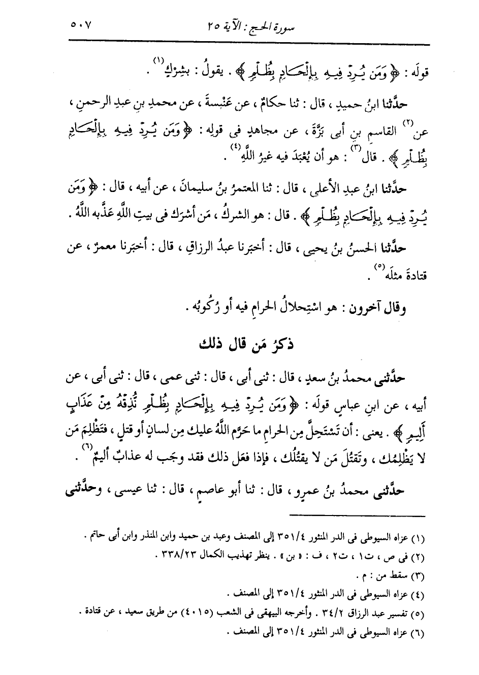 حَدَّثَنِي مُحَمَّدُ بْنُ عَمْرٍو، قَالَ: ثنا أَبُو عَاصِمٍ، قَالَ: ثنا عِيسَى، وَحَدَّثَنِي -[508]- الْحَارِثُ، قَالَ: ثنا الْحَسَنُ، قَالَ: ثنا وَرْقَاءُ، جَمِيعًا، عَنِ ابْنِ أَبِي نَجِيحٍ، عَنْ مُجَاهِدٍ: {وَمَنْ يُرِدْ فِيهِ بِإِلْحَادٍ بِظُلْمٍ} [الحج: 25] قَالَ: «§يَعْمَلُ فِيهِ عَمَلًا سَيِّئًا» حَدَّثَنَا الْقَاسِمُ قَالَ: ثنا الْحُسَيْنُ قَالَ: ثني حَجَّاجٌ، عَنِ ابْنِ جُرَيْجٍ، عَنْ مُجَاهِدٍ مِثْلَهُ