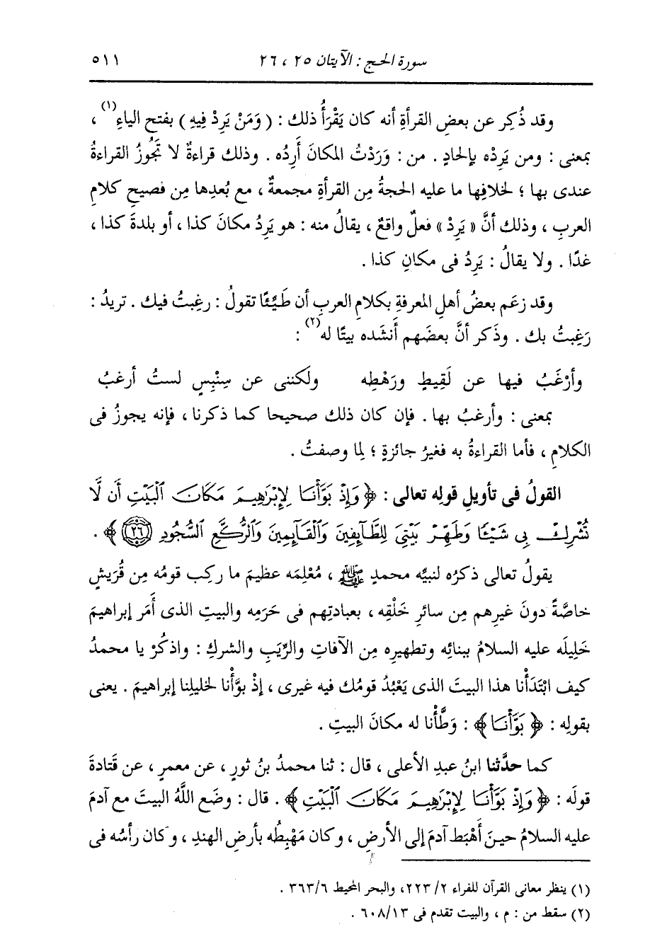 §الْقَوْلُ فِي تَأْوِيلِ قَوْلِهِ تَعَالَى: {وَإِذْ بَوَّأْنَا لِإِبْرَاهِيمَ مَكَانَ الْبَيْتِ أَنْ لَا تُشْرِكْ بِي شَيْئًا وَطَهِّرْ بَيْتِيَ لِلطَّائِفِينَ وَالْقَائِمِينَ وَالرُّكَّعِ السُّجُودِ} [الحج: 26] يَقُولُ تَعَالَى ذِكْرُهُ لِنَبِيِّهِ مُحَمَّدٍ صَلَّى اللهُ عَلَيْهِ وَسَلَّمَ، مُعْلِمَهُ عَظِيمَ مَا رَكِبَ مِنْ قَوْمِهِ قُرَيْشٍ خَاصَّةً دُونَ غَيْرِهِمْ مِنْ سَائِرِ خَلْقِهِ بِعِبَادَتِهِمْ فِي حَرَمِهِ، وَالْبَيْتِ الَّذِي أَمَرَ إِبْرَاهِيمَ خَلِيلَهُ صَلَّى اللهُ عَلَيْهِ وَسَلَّمَ بِبِنَائِهِ وَتَطْهِيرِهِ مِنَ الْآفَاتِ وَالرِّيَبِ وَالشِّرْكِ: وَاذْكُرْ يَا مُحَمَّدُ , كَيْفَ ابْتَدَأْنَا هَذَا الْبَيْتَ الَّذِي يَعْبُدُ قَوْمُكَ فِيهِ غَيْرِي، إِذْ بَوَّأْنَا لِخَلِيلِنَا إِبْرَاهِيمَ، يَعْنِي بِقَوْلِهِ: {بَوَّأْنَا} [يونس: 93] : وَطَّأْنَا لَهُ مَكَانَ الْبَيْتِ