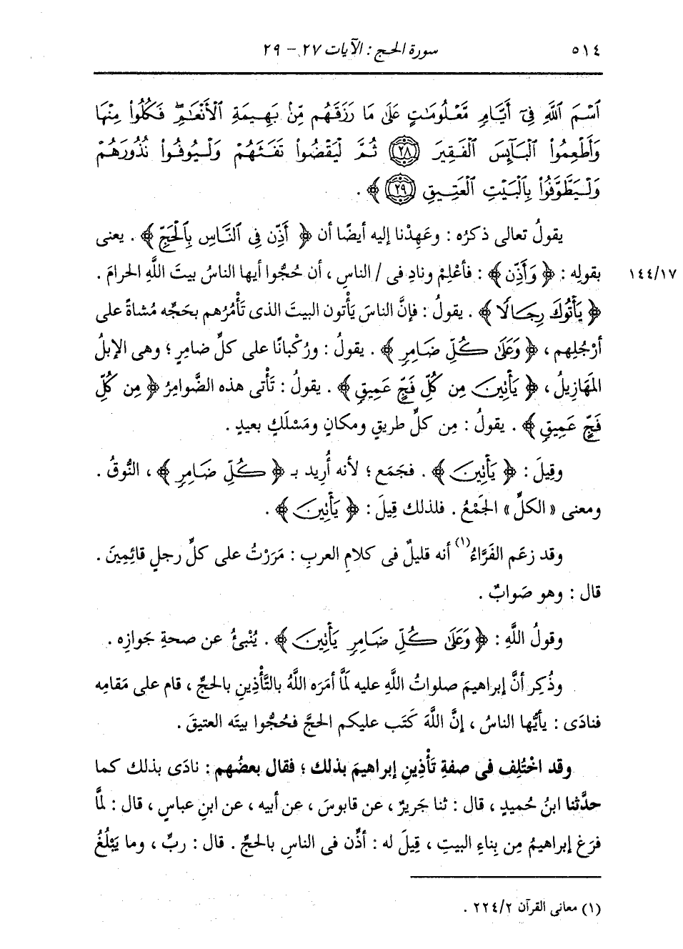 اسْمَ اللَّهِ فِي أَيَّامٍ مَعْلُومَاتٍ عَلَى مَا رَزَقَهُمْ مِنْ بَهِيمَةِ الْأَنْعَامِ فَكُلُوا مِنْهَا وَأَطْعِمُوا الْبَائِسَ الْفَقِيرَ ثُمَّ لِيَقْضُوا تَفَثَهُمْ وَلْيُوفُوا نُذُورَهُمْ وَلْيَطَّوَّفُوا بِالْبَيْتِ الْعَتِيقِ} [الحج: 28] يَقُولُ تَعَالَى ذِكْرُهُ: عَهِدْنَا إِلَيْهِ أَيْضًا أَنْ أَذِّنْ فِي النَّاسِ بِالْحَجِّ , يَعْنِي بِقَوْلِهِ: {وَأذِّنْ} [الحج: 27] أَعْلِمْ وَنَادِ فِي النَّاسِ أَنْ حُجُّوا أَيُّهَا النَّاسُ بَيْتَ اللَّهِ الْحَرَامَ {يَأْتُوكَ رِجَالاً} [الحج: 27] يَقُولُ فَإِنَّ النَّاسَ يَأْتُونَ الْبَيْتَ الَّذِي تَأمَّرَهُمْ بِحَجِّهِ مُشَاةً عَلَى أَرْجُلِهِمْ {وَعَلَى كُلِّ ضَامِرٍ} [الحج: 27] يَقًولُ وَرُكْبَانًا عَلَى كُلِّ ضَامِرٍ وَهِيَ الْإِبِلُ الْمَهَازِيلُ {يَأْتِينَ مِن كُلِّ فَجٍّ عَميِقٍ} [الحج: 27] يَقُولُ تَأْتِي هَذِهِ الضَّوَامِرُ مِنْ كُلِّ فَجٍّ عَمِيقٍ يَقُولُ: مِنْ كُلِّ طَرِيقٍ وَمَكَانٍ وَمَسْلَكٍ بَعِيدٍ وَقِيلَ يَأْتِينَ فَجُمِعَ لِأَنَّهُ أُرِيدَ بِكُلِّ ضَامِرٍ النُّوقُ وَمَعْنَى الْكُلِّ الْجَمْعُ فَلِذَلِكَ قِيلَ يَأْتِينَ وَقَدْ زَعَمَ الْفَرَّاءُ أَنَّهُ قَلِيلٌ فِي كَلَامِ الْعَرَبِ مَرَرْتُ عَلَى كُلِّ رَجُلٍ قَائِمَينِ قَالَ: وَهُوَ صَوَابٌ وَقَوْلُ اللَّهِ: {وَعَلَى كُلِّ ضَامِرٍ يَأْتِينَ} [الحج: 27] يُنْبِئُ عَنْ صِحَّةِ جَوَازِهِ. وَذُكِرَ أَنَّ إِبْرَاهِيمَ صَلَوَاتُ اللَّهِ عَلَيْهِ لَمَّا أَمَرَهُ اللَّهُ بِالتَّأْذِينِ بِالْحَجِّ، قَامَ عَلَى مَقَامِهِ فَنَادَى: يَا أَيُّهَا النَّاسُ , إِنَّ اللَّهَ كَتَبَ عَلَيْكُمُ الْحَجَّ , فَحُجُّوا بَيْتَهُ الْعَتِيقَ. وَقَدِ اخْتُلِفَ فِي صِفَةِ تَأْذِينِ إِبْرَاهِيمَ بِذَلِكَ فَقَالَ بَعْضُهُمْ: نَادَى بِذَلِكَ