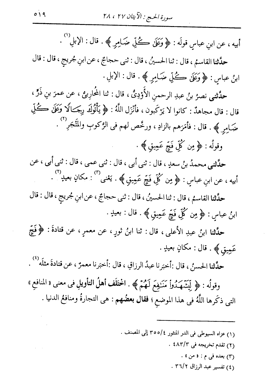 حَدَّثَنَا ابْنُ عَبْدِ الْأَعْلَى، قَالَ: ثنا ابْنُ ثَوْرٍ، عَنْ مَعْمَرٍ، عَنْ قَتَادَةَ: {فَجٍّ عَمِيقٍ} [الحج: 27] قَالَ: «§مَكَانٍ بَعِيدٍ» حَدَّثَنَا الْحَسَنُ قَالَ: أَخْبَرَنَا عَبْدُ الرَّزَّاقِ قَالَ: أَخْبَرَنَا مَعْمَرٌ، عَنْ قَتَادَةَ مِثْلَهُ