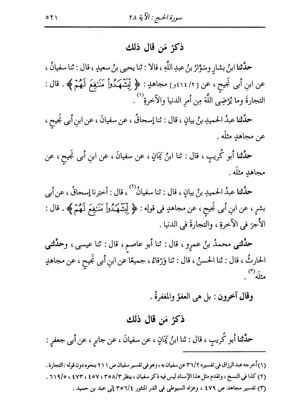 ذِكْرُ مَنْ قَالَ ذَلِكَ: حَدَّثَنَا ابْنُ بَشَّارٍ، وَسَوَّارُ بْنُ عَبْدِ اللَّهِ، قَالَا: ثنا يَحْيَى بْنُ سَعِيدٍ، قَالَ: ثنا سُفْيَانُ، عَنِ ابْنِ أَبِي نَجِيحٍ، عَنْ مُجَاهِدٍ: {لِيَشْهَدُوا مَنَافِعَ لَهُمْ} [الحج: 28] قَالَ: «§التِّجَارَةُ، وَمَا يُرْضِي اللَّهَ مِنْ أَمْرِ الدُّنْيَا وَالْآخِرَةِ» حَدَّثَنَا عَبْدُ الْحَمِيدِ بْنُ بَيَانٍ قَالَ: ثنا إِسْحَاقُ، عَنْ سُفْيَانَ عَنِ ابْنِ أَبِي نَجِيحٍ، عَنْ مُجَاهِدٍ، مِثْلَهُ حَدَّثَنَا أَبُو كُرَيْبٍ قَالَ: ثنا ابْنُ يَمَانٍ، عَنْ سُفْيَانَ، عَنِ ابْنِ أَبِي نَجِيحٍ، عَنْ مُجَاهِدٍ، مِثْلَهُ