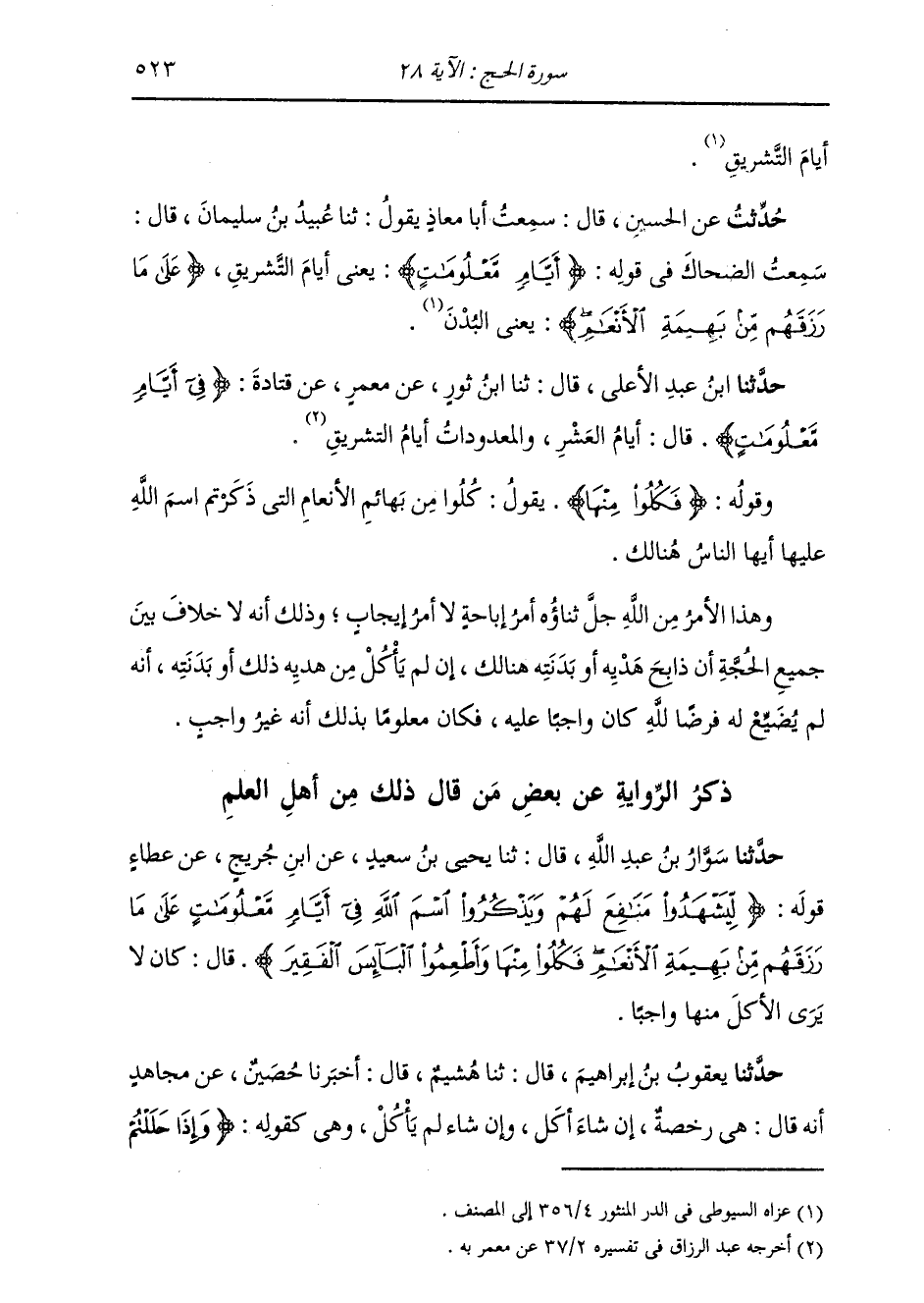 حُدِّثْتُ عَنِ الْحُسَيْنِ، قَالَ: سَمِعْتُ أَبَا مُعَاذٍ، يَقُولُ: ثنا عُبَيْدُ بْنُ سُلَيْمَانَ، قَالَ: سَمِعْتُ الضَّحَّاكَ، فِي قَوْلِهِ: {أَيَّامٍ مَعْلُومَاتٍ} [الحج: 28] «§يَعْنِي أَيَّامَ التَّشْرِيقِ» ، {عَلَى مَا رَزَقَهُمْ مِنْ بَهِيمَةِ الْأَنْعَامِ} [الحج: 28] «يَعْنِي الْبُدْنَ»