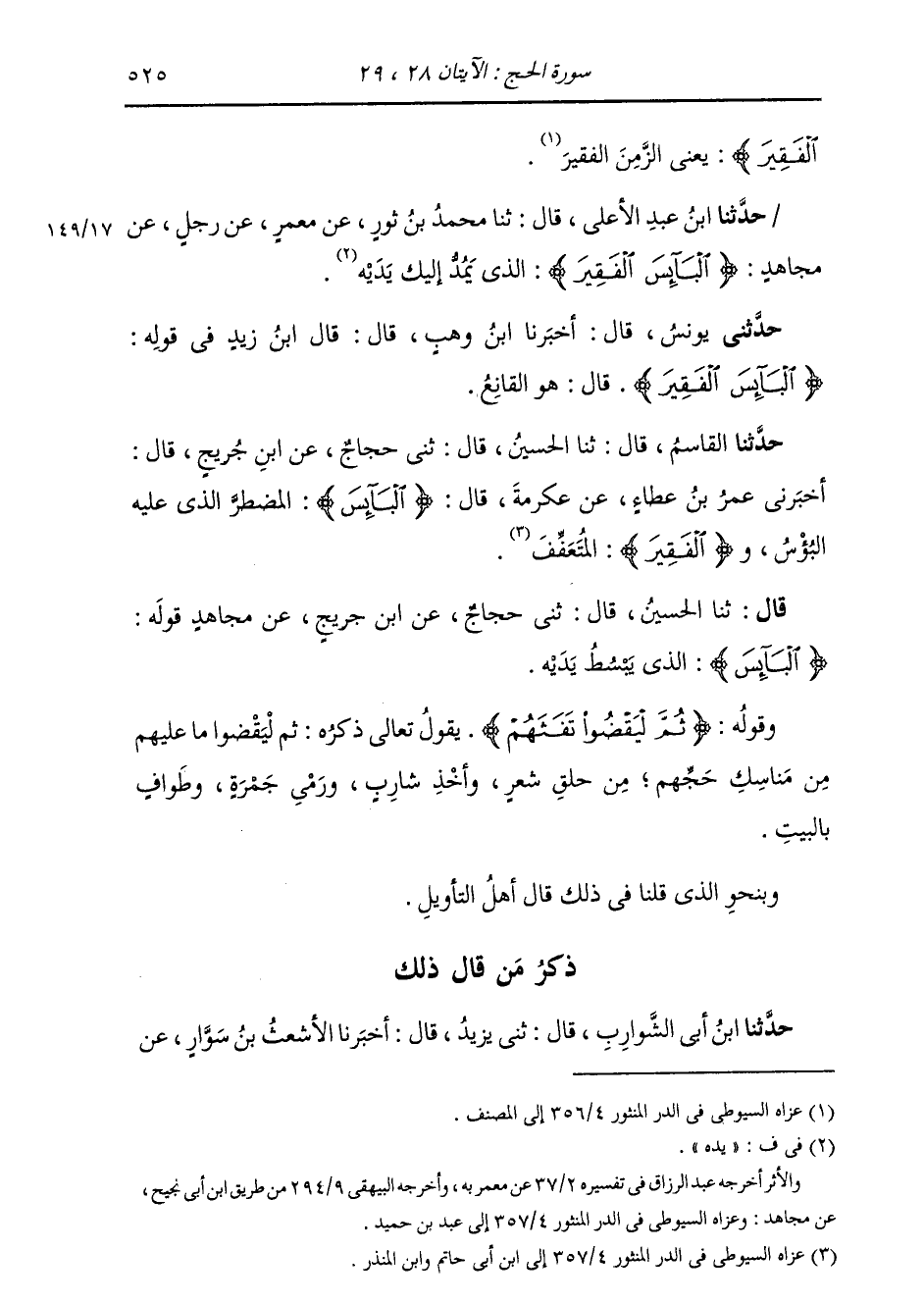 قَالَ: ثنا الْحُسَيْنُ قَالَ: ثني حَجَّاجٌ، عَنِ ابْنِ جُرَيْجٍ، عَنْ مُجَاهِدٍ، قَوْلُهُ: {الْبَائِسَ} [الحج: 28] «§الَّذِي يَبْسُطُ يَدَيْهِ»