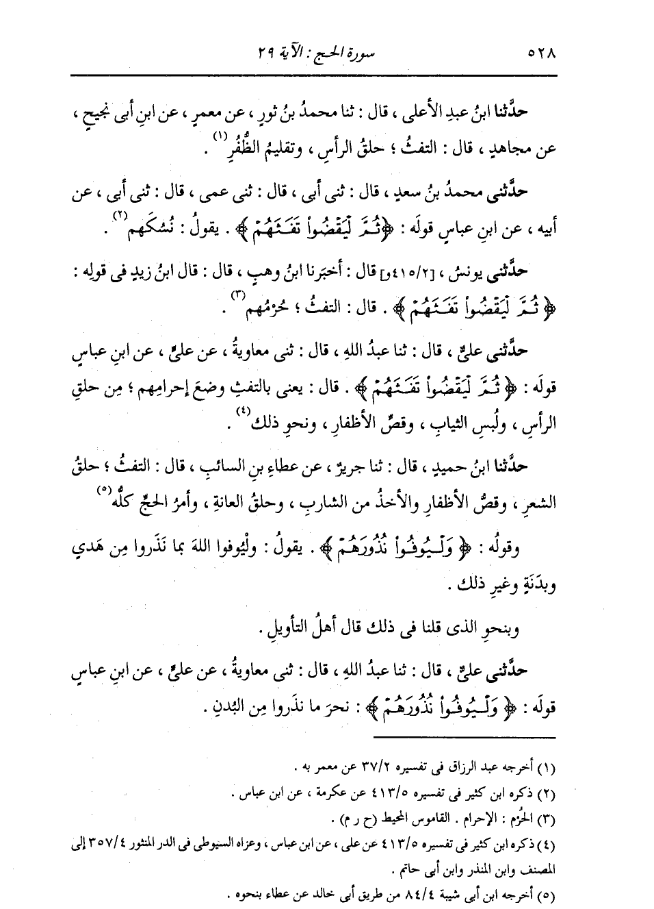 حَدَّثَنِي عَلِيُّ، قَالَ: ثنا عَبْدُ اللَّهِ، قَالَ: ثني مُعَاوِيَةُ، عَنْ عَلِيٍّ، عَنِ ابْنِ عَبَّاسٍ، قَوْلُهُ: {ثُمَّ لِيَقْضُوا تَفَثَهُمْ} [الحج: 29] قَالَ: " §يَعْنِي بِالتَّفَثِ: وَضْعَ إِحْرَامِهِمْ , مِنْ حَلْقِ الرَّأْسِ، وَلَبْسِ الثِّيَابِ، وَقَصِّ الْأَظْفَارِ , وَنَحْوَ ذَلِكَ "