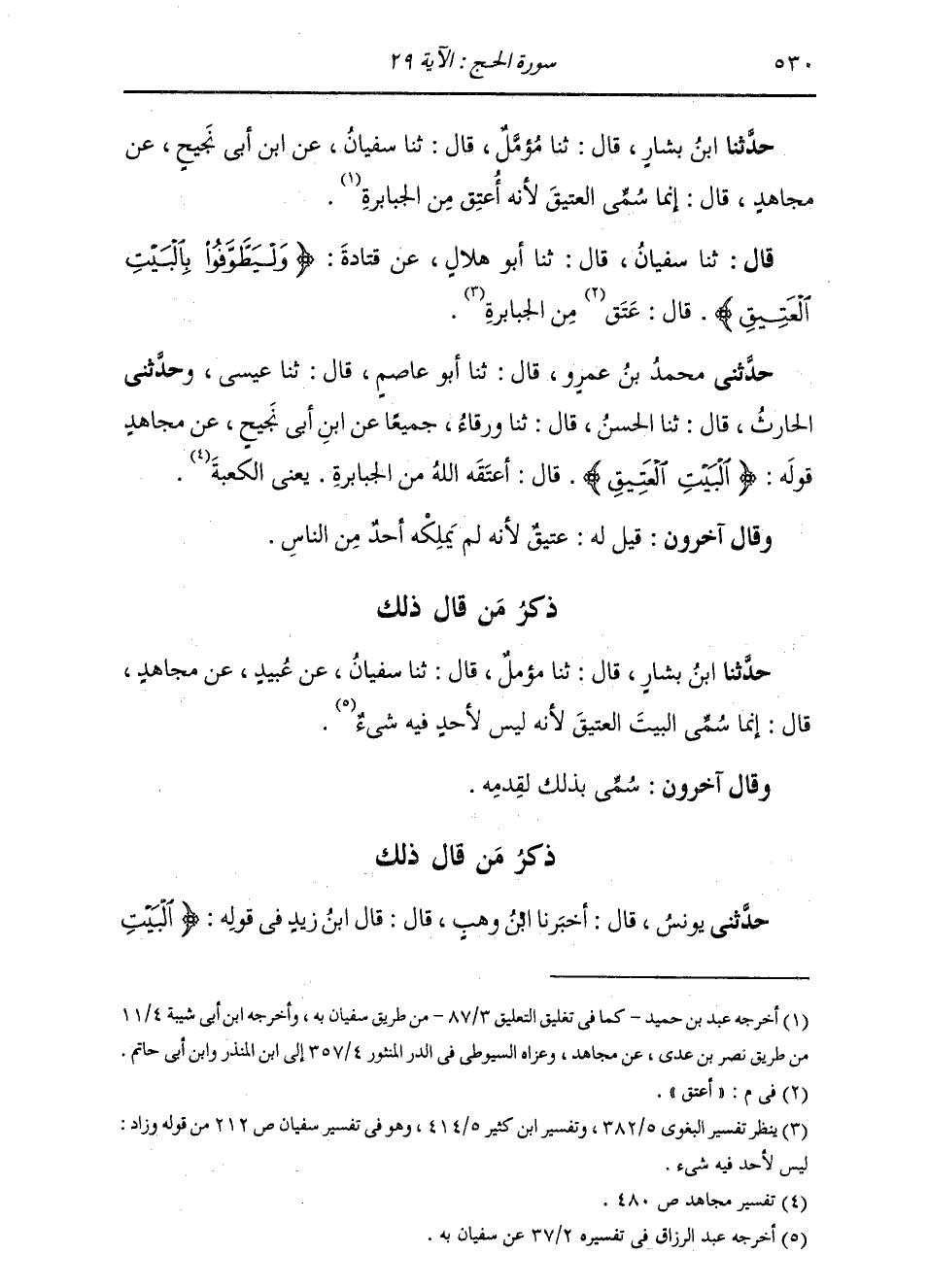 حَدَّثَنَا ابْنُ بَشَّارٍ، قَالَ: ثنا مُؤَمَّلٌ، قَالَ: ثنا سُفْيَانُ، عَنِ ابْنِ أَبِي نَجِيحٍ، عَنْ مُجَاهِدٍ، قَالَ: «§إِنَّمَا سُمِّيَ الْعَتِيقَ، لِأَنَّهُ أُعْتِقَ مِنَ الْجَبَابِرَةِ»