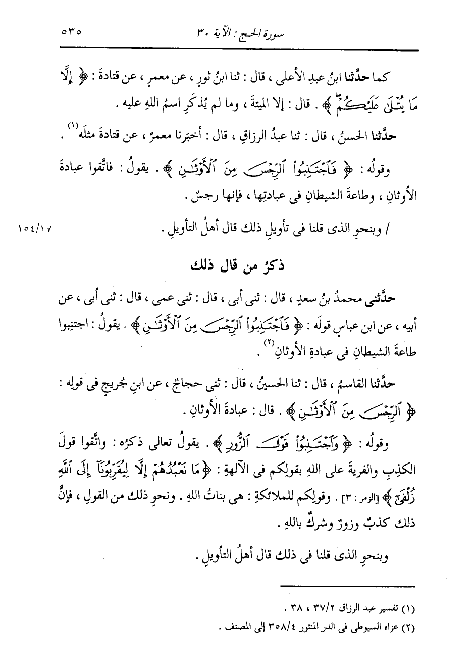 §وَقَوْلُهُ: {فَاجْتَنِبُوا الرِّجْسَ مِنَ الْأَوْثَانِ} [الحج: 30] يَقُولُ: فَاتَّقُوا عِبَادَةَ الْأَوْثَانِ، وَطَاعَةَ الشَّيْطَانِ فِي عِبَادَتِهَا , فَإِنَّهَا رِجْسٌ وَبِنَحْوِ الَّذِي قُلْنَا فِي تَأْوِيلِ ذَلِكَ قَالَ أَهْلُ التَّأْوِيلِ