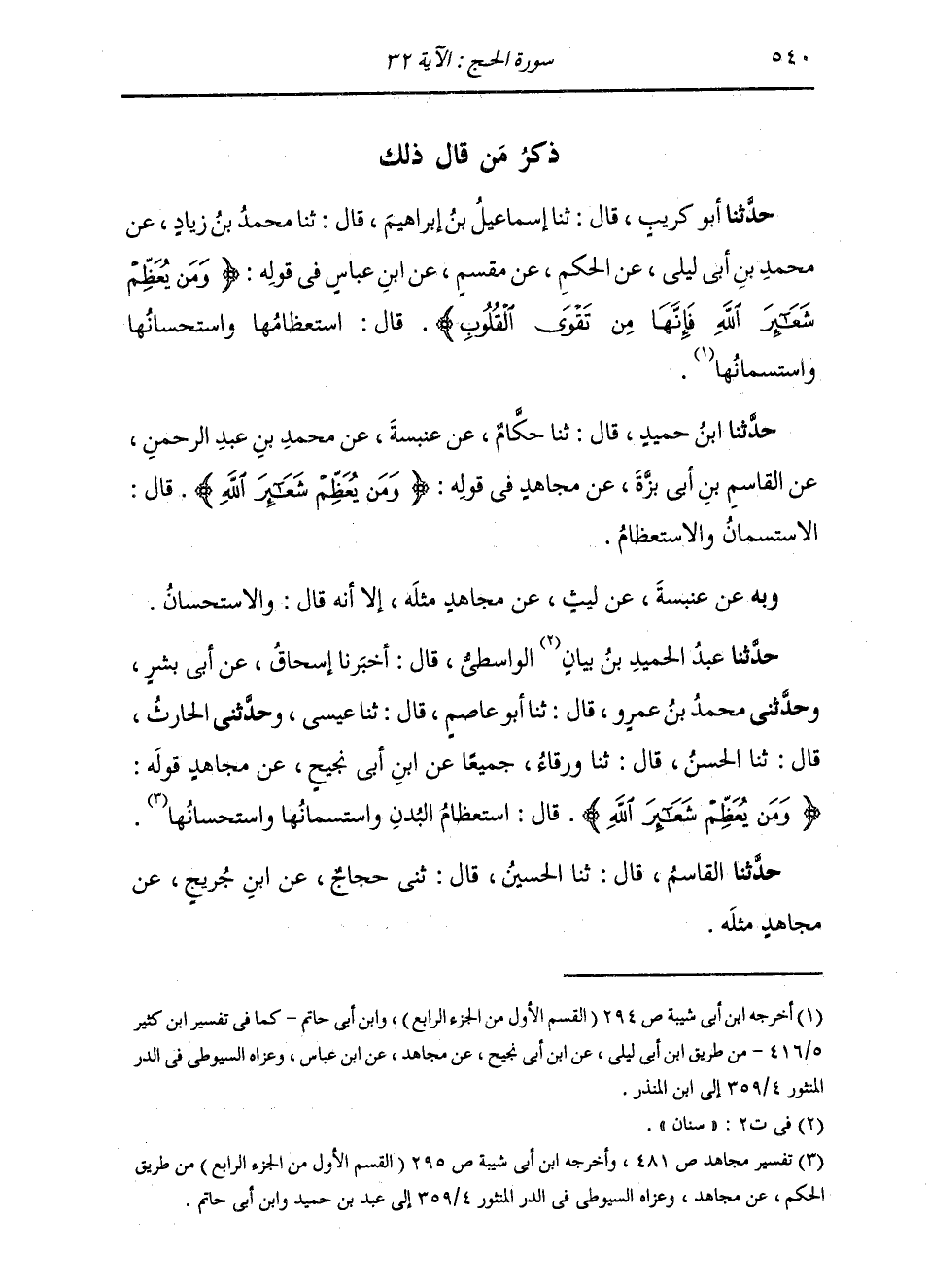 حَدَّثَنَا عَبْدُ الْحَمِيدِ بْنُ بَيَانٍ الْوَاسِطِيُّ، قَالَ: أَخْبَرَنَا إِسْحَاقُ، عَنْ أَبِي بِشْرٍ، وَحَدَّثَنِي مُحَمَّدُ بْنُ عَمْرٍو، قَالَ: ثنا أَبُو عَاصِمٍ، قَالَ: ثنا عِيسَى، وَحَدَّثَنِي الْحَارِثُ، قَالَ: ثنا الْحَسَنُ، قَالَ: ثنا وَرْقَاءُ، جَمِيعًا عَنِ ابْنِ أَبِي نَجِيحٍ، عَنْ مُجَاهِدٍ، قَوْلُهُ: {وَمَنْ يُعَظِّمْ شَعَائِرَ اللَّهِ} [الحج: 32] قَالَ: «§اسْتِعْظَامُ الْبُدْنِ، وَاسْتِسمْانُهَا، وَاسْتِحْسَانُهَا» حَدَّثَنَا الْقَاسِمُ قَالَ: ثنا الْحُسَيْنُ قَالَ: ثني حَجَّاجٌ، عَنِ ابْنِ جُرَيْجٍ، عَنْ مُجَاهِدٍ، مِثْلَهُ