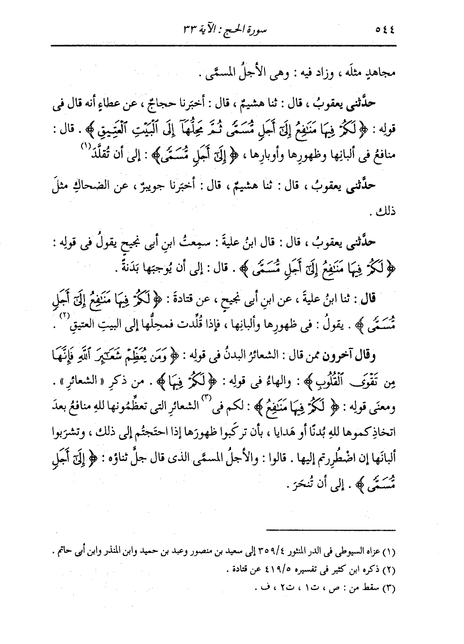 حَدَّثَنِي يَعْقُوبُ، قَالَ: ثنا هُشَيْمٌ، قَالَ: أَخْبَرَنَا حَجَّاجٌ، عَنْ عَطَاءٍ، أَنَّهُ قَالَ فِي قَوْلِهِ: {لَكُمْ فِيهَا مَنَافِعُ إِلَى أَجَلٍ مُسَمًّى ثُمَّ مَحِلُّهَا إِلَى الْبَيْتِ الْعَتِيقِ} [الحج: 33] قَالَ: " §مَنَافِعُ فِي أَلْبَانِهَا , وَظُهُورِهَا , وَأَوْبَارِهَا {إِلَى أَجَلٍ مُسَمًّى} [البقرة: 282] إِلَى أَنْ تُقَلَّدَ " حَدَّثَنِي يَعْقُوبُ، قَالَ: ثنا هُشَيْمٌ، قَالَ: أَخْبَرَنَا جُوَيْبِرٌ، عَنِ الضَّحَّاكِ، مِثْلُ ذَلِكَ
