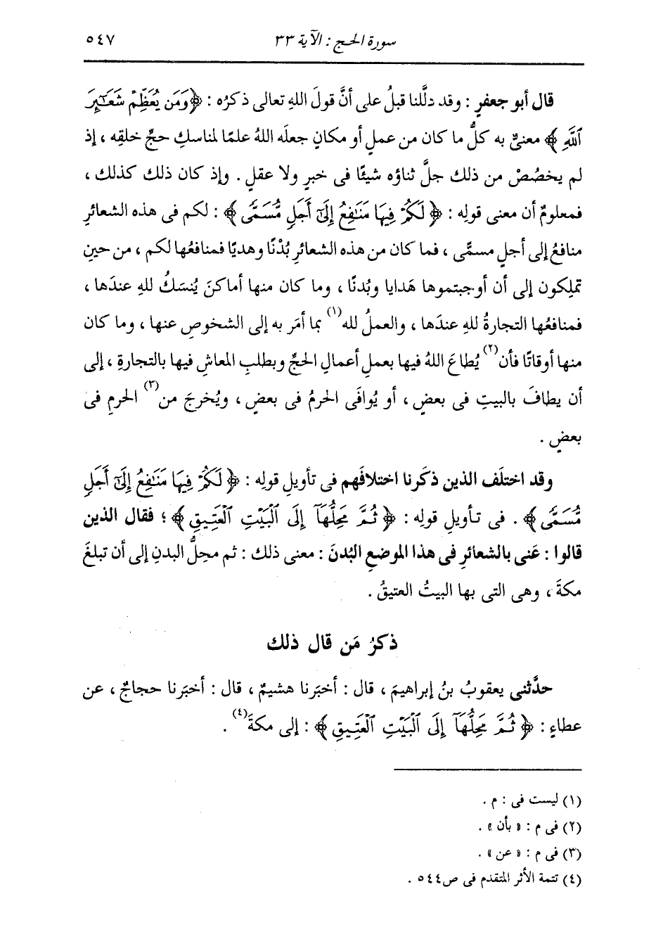 ذِكْرُ مَنْ قَالَ ذَلِكَ: حَدَّثَنِي يَعْقُوبُ بْنُ إِبْرَاهِيمَ، قَالَ: أَخْبَرَنَا هُشَيْمٌ، قَالَ: أَخْبَرَنَا حَجَّاجٌ، عَنْ عَطَاءٍ: {ثُمَّ مَحِلُّهَا إِلَى الْبَيْتِ الْعَتِيقِ} [الحج: 33] إِلَى «§مَكَّةَ»