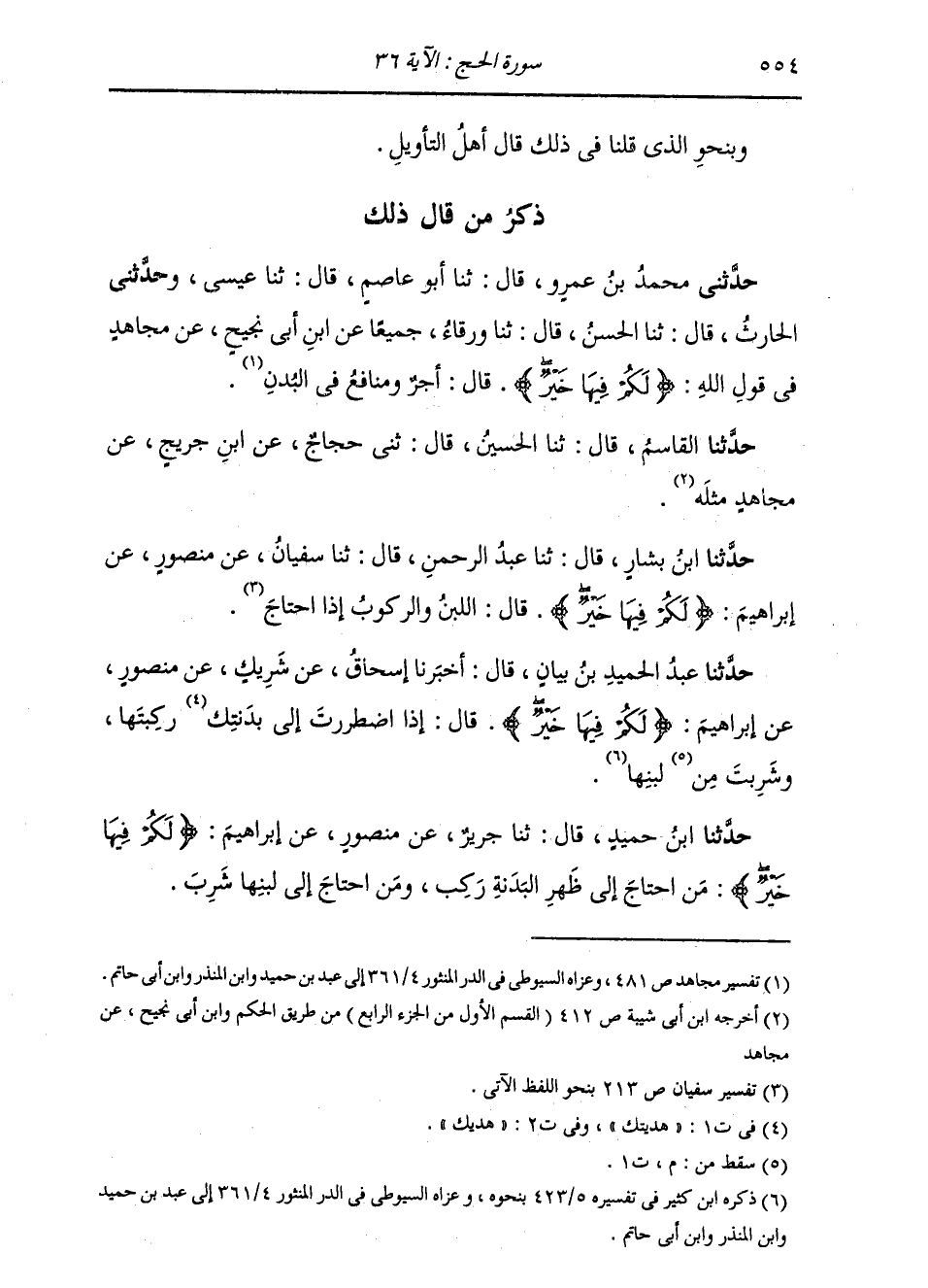 ذِكْرُ مَنْ قَالَ ذَلِكَ: حَدَّثَنِي مُحَمَّدُ بْنُ عَمْرٍو، قَالَ: ثنا أَبُو عَاصِمٍ، قَالَ: ثنا عِيسَى، وَحَدَّثَنِي الْحَارِثُ، قَالَ: ثنا الْحَسَنُ، قَالَ: ثنا وَرْقَاءُ، جَمِيعًا، عَنِ ابْنِ أَبِي نَجِيحٍ، عَنْ مُجَاهِدٍ، فِي قَوْلِ اللَّهِ: {لَكُمْ فِيهَا خَيْرٌ} [الحج: 36] قَالَ: «§أَجْرٌ وَمَنَافِعُ فِي الْبُدْنِ» حَدَّثَنَا الْقَاسِمُ قَالَ: ثنا الْحُسَيْنُ قَالَ: ثني حَجَّاجٌ، عَنِ ابْنِ جُرَيْجٍ، عَنْ مُجَاهِدٍ، مِثْلَهُ