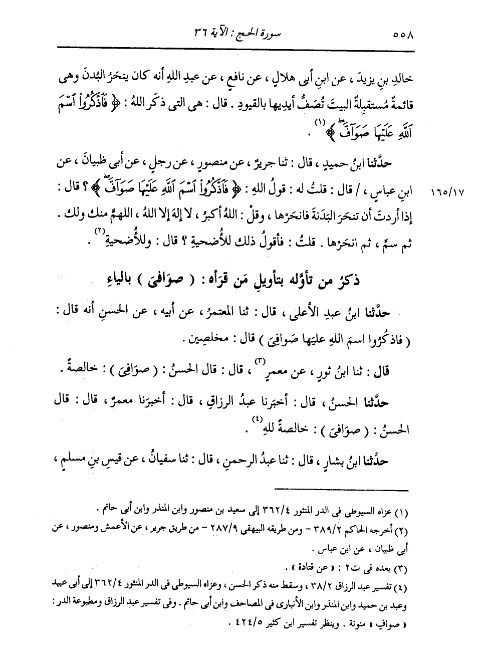 ذِكْرُ مَنْ تَأَوَّلَهُ بِتَأْوِيلِ مِنْ قَرَأَهُ: «صَوَافِيَ» بِالْيَاءِ: حَدَّثَنَا ابْنُ عَبْدِ الْأَعْلَى، قَالَ: ثنا الْمُعْتَمِرُ، عَنْ أَبِيهِ، عَنِ الْحَسَنِ، أَنَّهُ قَالَ: (فَاذْكُرُوا اسْمَ اللَّهِ عَلَيْهَا صَوَافِيَ) قَالَ: «§مُخْلَصِينَ»