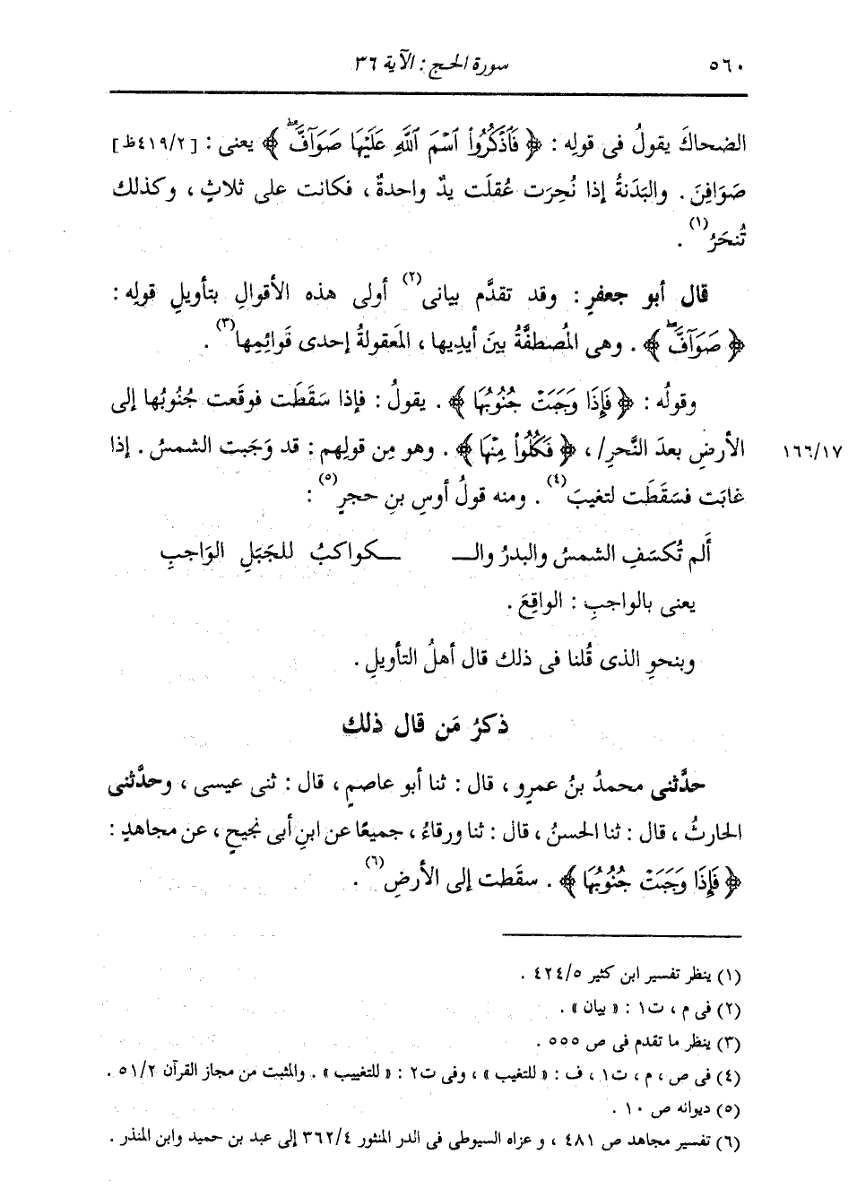 ذِكْرُ مَنْ قَالَ ذَلِكَ: حَدَّثَنِي مُحَمَّدُ بْنُ عَمْرٍو، قَالَ: ثنا أَبُو عَاصِمٍ، قَالَ: ثني عِيسَى؛ وَحَدَّثَنِي الْحَارِثُ، قَالَ: ثنا الْحَسَنُ، قَالَ: ثنا وَرْقَاءُ، جَمِيعًا، عَنِ ابْنِ أَبِي نَجِيحٍ، عَنْ مُجَاهِدٍ: {فَإِذَا وَجَبَتْ جُنُوبُهَا} [الحج: 36] «§سَقَطَتْ إِلَى الْأَرْضِ» -[561]- حَدَّثَنَا الْقَاسِمُ قَالَ: ثنا الْحُسَيْنُ قَالَ: ثني حَجَّاجٌ، عَنِ ابْنِ جُرَيْجٍ، عَنْ مُجَاهِدٍ، مِثْلَهُ