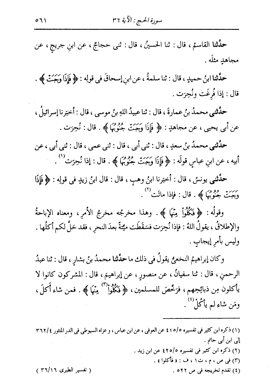 حَدَّثَنَا ابْنُ حُمَيْدٍ، قَالَ: ثنا سَلَمَةُ، عَنِ ابْنِ إِسْحَاقَ، فِي قَوْلِهِ: {فَإِذَا وَجَبَتْ جُنُوبُهَا} [الحج: 36] قَالَ: «§إِذَا فَرَغَتْ وَنُحِرَتْ»