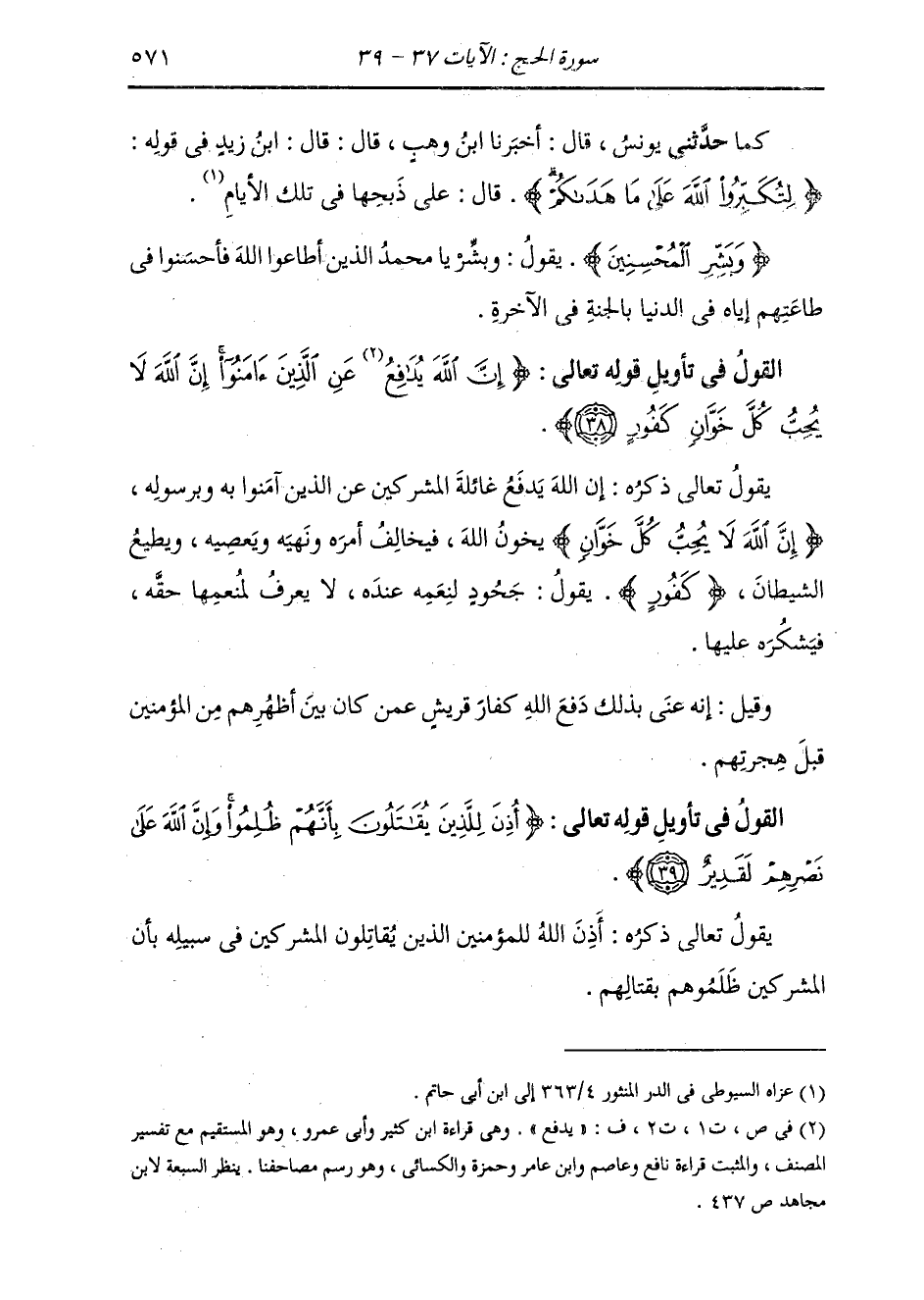 §الْقَوْلُ فِي تَأْوِيلِ قَوْلِهِ تَعَالَى: {أُذِنَ لِلَّذِينَ يُقَاتِلُونَ بِأَنَّهُمْ ظُلِمُوا وَإِنَّ اللَّهَ عَلَى نَصْرِهِمْ لَقَدِيرٌ} [الحج: 39] يَقُولُ تَعَالَى ذِكْرُهُ: أَذِنَ اللَّهُ لِلْمُؤْمِنِينَ الَّذِينَ يُقَاتِلُونَ الْمُشْرِكِينَ فِي سَبِيلِهِ بِأَنَّ الْمُشْرِكِينَ ظَلَمُوهُمْ بِقِتَالِهِمْ.