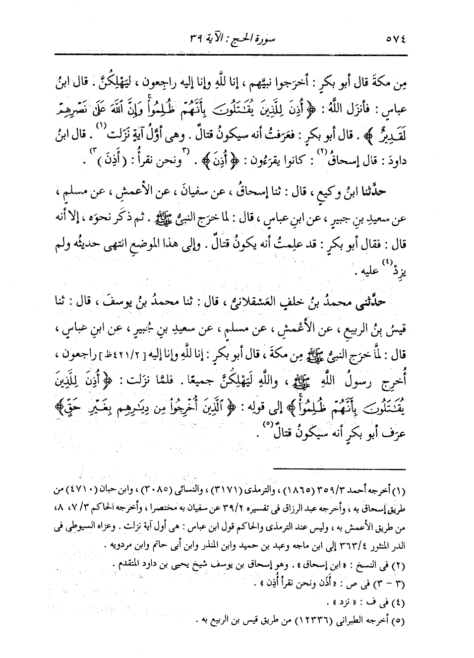 حَدَّثَنِي مُحَمَّدُ بْنُ خَلَفٍ الْعَسْقَلَانِيُّ قَالَ: ثنا مُحَمَّدُ بْنُ يُوسُفَ قَالَ: ثنا قَيْسُ بْنُ الرَّبِيعِ، عَنِ الْأَعْمَشِ، عَنْ مُسْلِمٍ، عَنْ سَعِيدِ بْنِ جُبَيْرٍ، عَنِ ابْنِ عَبَّاسٍ قَالَ: " §لَمَّا خَرَجَ رَسُولُ اللَّهِ صَلَّى اللهُ عَلَيْهِ وَسَلَّمَ مِنْ مَكَّةَ قَالَ أَبُو بَكْرٍ: إِنَّا لِلَّهِ وَإِنَّا إِلَيْهِ رَاجِعُونَ، أُخْرِجَ رَسُولُ اللَّهِ صَلَّى اللهُ عَلَيْهِ وَسَلَّمَ، وَاللَّهِ لَيَهْلِكُنَّ جَمِيعًا فَلَمَّا نَزَلَتْ: {أُذِنَ لِلَّذِينَ يُقَاتِلُونَ بِأَنَّهُمْ ظُلِمُوا} [الحج: 39] . إِلَى قَوْلِهِ: {الَّذِينَ أُخْرِجُوا مِنْ دِيَارِهِمْ بِغَيْرِ حَقٍّ} [الحج: 40] عَرَفَ أَبُو بَكْرٍ أَنَّهُ سَيَكُونُ قِتَالٌ "
