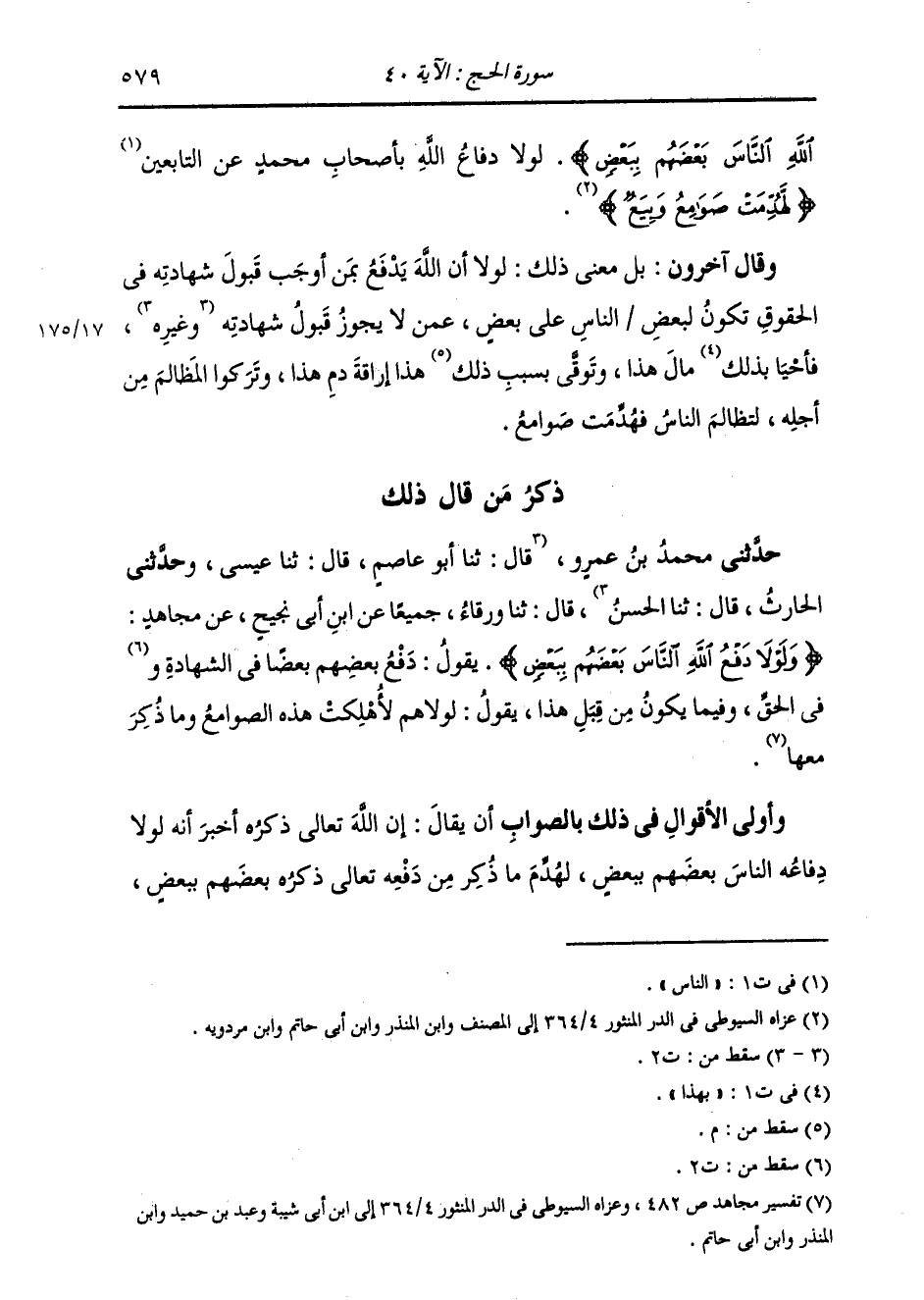 ذِكْرُ مَنْ قَالَ ذَلِكَ حَدَّثَنِي مُحَمَّدُ بْنُ عَمْرٍو، قَالَ: ثنا أَبُو عَاصِمٍ، قَالَ: ثنا عِيسَى، وَحَدَّثَنِي الْحَارِثُ، قَالَ: ثنا الْحَسَنُ، قَالَ: ثنا وَرْقَاءُ، جَمِيعًا، عَنِ ابْنِ أَبِي نَجِيحٍ، عَنْ مُجَاهِدٍ: {وَلَوْلَا دَفْعُ اللَّهِ النَّاسَ بَعْضَهُمْ بِبَعْضٍ} [البقرة: 251] يَقُولُ: " §دَفْعُ بَعْضِهِمْ بَعْضًا فِي الشَّهَادَةِ، وَفِي الْحَقِّ، وَفِيمَا يَكُونُ مِنْ قِبَلِ هَذَا. يَقُولُ: لَوْلَاهُمْ لَأُهْلِكَتْ هَذِهِ الصَّوَامِعُ وَمَا ذُكِرَ مَعَهَا " وَأَوْلَى الْأَقْوَالِ فِي ذَلِكَ بِالصَّوَابِ أَنْ يُقَالَ: إِنَّ اللَّهَ تَعَالَى ذِكْرُهُ أَخْبَرَ أَنَّهُ لَوْلَا دِفَاعَهُ النَّاسَ بَعْضَهُمْ بِبَعْضٍ، لَهُدِّمَ مَا ذَكَرَ، مِنْ دَفْعِهِ تَعَالَى ذِكْرُهُ بَعْضَهُمْ بِبَعْضٍ، -[580]- وَكَفِّهِ الْمُشْرِكِينَ بِالْمُسْلِمِينَ عَنْ ذَلِكَ؛ وَمِنْهُ كَفُّهُ بِبَعْضِهِمُ التَّظَالُمَ، كَالسُّلْطَانِ الَّذِي كَفَّ بِهِ رَعِيَّتَهُ عَنِ التَّظَالُمِ بَيْنَهُمْ؛ وَمِنْهُ كَفُّهُ لِمَنْ أَجَازَ شَهَادَتَهُ بَيْنَهُمْ بِبَعْضِهِمْ عَنِ الذَّهَابِ بِحَقِّ مَنْ لَهُ قِبَلَهُ حَقٌّ، وَنَحْوُ ذَلِكَ. وَكُلُّ ذَلِكَ دَفْعٌ مِنْهُ النَّاسَ بَعْضَهُمْ عَنْ بَعْضٍ، لَوْلَا ذَلِكَ لَتَظَالَمُوا، فَهَدَّمَ الْقَاهِرُونَ صَوَامِعَ الْمَقْهُورِينَ , وَبِيَعَهُمْ , وَمَا سَمَّى جَلَّ ثَنَاؤُهُ. وَلَمْ يَضَعِ اللَّهُ تَعَالَى دَلَالَةً فِي عَقْلٍ عَلَى أَنَّهُ عَنَى مِنْ ذَلِكَ بَعْضًا دُونَ بَعْضٍ، وَلَا جَاءَ بِأَنَّ ذَلِكَ كَذَلِكَ خَبَرٌ يَجِبُ التَّسْلِيمُ لَهُ، فَذَلِكَ عَلَى الظَّاهِرِ وَالْعُمُومِ , عَلَى مَا قَدْ بَيَّنْتُهُ قَبْلُ , لِعُمُومِ ظَاهِرِ ذَلِكَ جَمِيعَ مَا ذَكَرْنَا