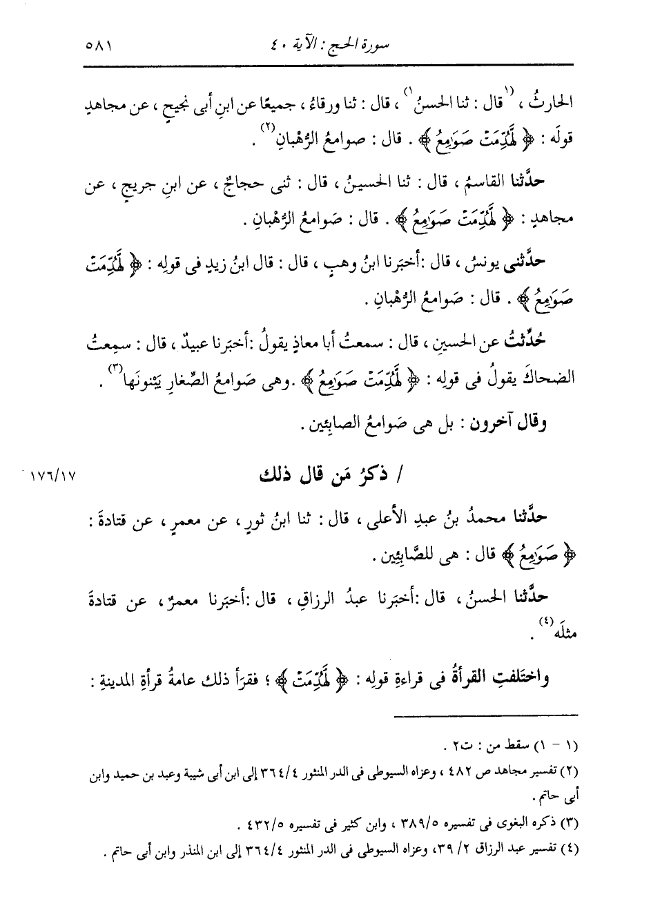 ذِكْرُ مَنْ قَالَ ذَلِكَ: حَدَّثَنَا مُحَمَّدُ بْنُ عَبْدِ الْأَعْلَى، قَالَ: ثنا ابْنُ ثَوْرٍ، عَنْ مَعْمَرٍ، عَنْ قَتَادَةَ: {صَوَامِعُ} [الحج: 40] قَالَ: «§هِيَ لِلصَّابِئِينَ» حَدَّثَنَا الْحَسَنُ قَالَ: أَخْبَرَنَا عَبْدُ الرَّزَّاقِ قَالَ: أَخْبَرَنَا مَعْمَرٌ، عَنْ قَتَادَةَ، مِثْلَهُ وَاخْتَلَفَتِ الْقُرَّاءُ فِي قِرَاءَةِ قَوْلِهِ: {لَهُدِّمَتْ} [الحج: 40] . فَقَرَأَ ذَلِكَ عَامَّةُ قُرَّاءِ الْمَدِينَةِ -[582]-: (لَهُدِمَتْ) خَفِيفَةً. وَقَرَأَتْهُ عَامَّةُ قُرَّاءِ أَهْلِ الْكُوفَةِ وَالْبَصْرَةِ: {لَهُدِّمَتْ} [الحج: 40] بِالتَّشْدِيدِ , بِمَعْنَى تَكْرِيرِ الْهَدْمِ فِيهَا مَرَّةً بَعْدَ مَرَّةٍ. وَالتَّشْدِيدُ فِي ذَلِكَ أَعْجَبُ الْقِرَاءَتَيْنِ إِلَيَّ. لِأَنَّ ذَلِكَ مِنْ أَفْعَالِ أَهْلِ الْكُفْرِ بِذَلِكَ