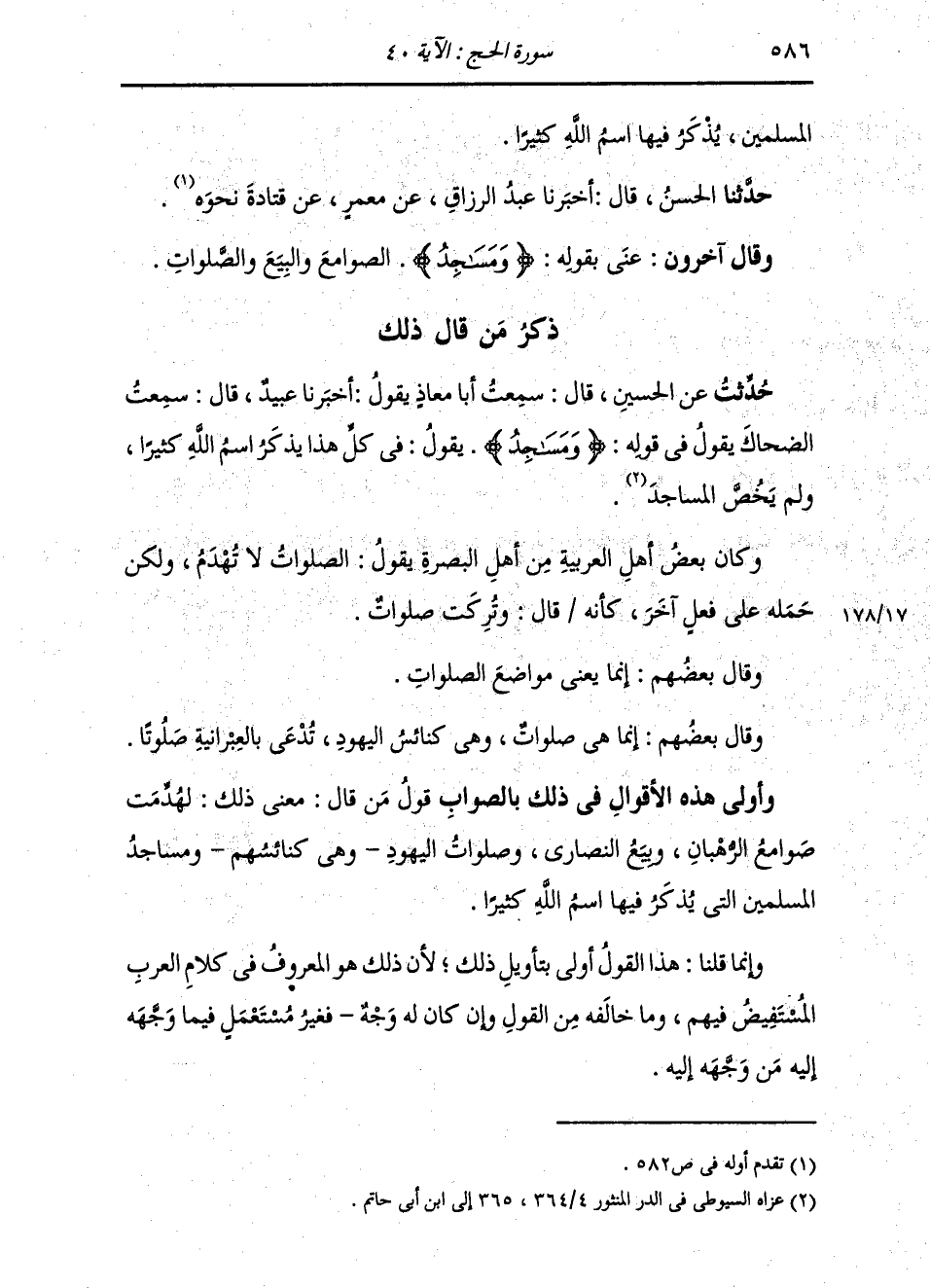 ذِكْرُ مَنْ قَالَ ذَلِكَ: حُدِّثْتُ عَنِ الْحُسَيْنِ قَالَ: سَمِعْتُ أَبَا مُعَاذٍ يَقُولُ: أَخْبَرَنَا عُبَيْدٌ قَالَ: سَمِعْتُ الضَّحَّاكَ يَقُولُ فِي قَوْلِهِ: {وَمَسَاجِدُ} [الحج: 40] «§يَقُولُ فِي كُلِّ هَذَا يُذْكَرُ اسْمُ اللَّهِ كَثِيرًا، وَلَمْ يَخُصَّ الْمَسَاجِدَ» وَكَانَ بَعْضُ أَهْلِ الْعَرَبِيَّةِ مِنْ أَهْلِ الْبَصْرَةِ يَقُولُ: الصَّلَوَاتُ لَا تُهَدَّمُ، وَلَكِنْ حَمَلَهُ عَلَى فِعْلٍ آخَرَ، كَأَنَّهُ قَالَ: وَتُرِكَتْ صَلَوَاتٌ. وَقَالَ بَعْضُهُمْ: إِنَّمَا يَعْنِي: مَوَاضِعَ الصَّلَوَاتِ. وَقَالَ بَعْضُهُمْ: إِنَّمَا هِيَ صَلَوَاتٌ، وَهِيَ كَنَائِسُ الْيَهُودِ، تُدْعَى بِالْعِبْرَانِيَّةِ: صَلُوتَا. وَأَوْلَى هَذِهِ الْأَقْوَالِ فِي ذَلِكَ بِالصَّوَابِ قَوْلُ مَنْ قَالَ: مَعْنَى ذَلِكَ: لَهُدِّمَتْ صَوَامِعُ الرُّهْبَانِ , وَبِيَعُ النَّصَارَى، وَصَلَوَاتُ الْيَهُودِ، وَهِيَ كَنَائِسُهُمْ، وَمَسَاجُدُ الْمُسْلِمِينَ الَّتِي يُذْكَرُ فِيهَا اسْمُ اللَّهِ كَثِيرًا. وَإِنَّمَا قُلْنَا هَذَا الْقَوْلَ أَوْلَى بِتَأْوِيلِ ذَلِكَ؛ لِأَنَّ ذَلِكَ هُوَ الْمَعْرُوفُ فِي كَلَامِ الْعَرَبِ الْمُسْتَفِيضِ فِيهِمْ، وَمَا خَالَفَهُ مِنَ الْقَوْلِ وَإِنْ كَانَ لَهُ وَجْهٌ فَغَيْرُ مُسْتَعْمَلٍ فِيمَا وَجَّهَهُ إِلَيْهِ مَنْ وَجَّهَهُ إِلَيْهِ