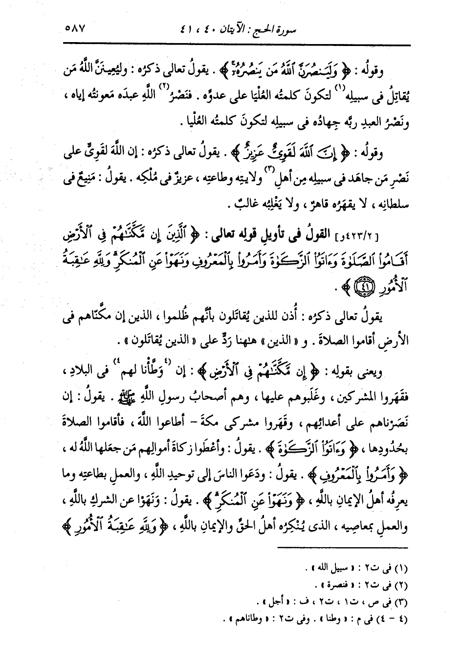 §الْقَوْلُ فِي تَأْوِيلِ قَوْلِهِ تَعَالَى: {الَّذِينَ إِنْ مَكَّنَّاهُمْ فِي الْأَرْضِ أَقَامُوا الصَّلَاةَ وَآتَوُا الزَّكَاةَ وَأَمَرُوا بِالْمَعْرُوفِ وَنَهَوْا عَنِ الْمُنكَرِ وَلِلَّهِ عَاقِبَةُ الْأُمُورِ} [الحج: 41] يَقُولُ تَعَالَى ذِكْرُهُ: أُذِنَ لِلَّذِينَ يُقَاتَلُونَ بِأَنَّهُمْ ظُلِمُوا، الَّذِينَ إِنْ مَكَّنَّاهُمْ فِي الْأَرْضِ أَقَامُوا الصَّلَاةَ. وَ {الَّذِينَ} [الفاتحة: 7] هَاهُنَا رَدٌّ عَلَى {الَّذِينَ يُقَاتَلُونَ} [الصف: 4]