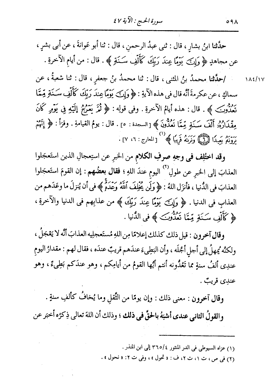 حَدَّثَنَا مُحَمَّدُ بْنُ الْمُثَنَّى، قَالَ: ثنا مُحَمَّدُ بْنُ جَعْفَرٍ، قَالَ: ثنا شُعْبَةُ، عَنْ سِمَاكٍ، عَنْ عِكْرِمَةَ، أَنَّهُ قَالَ فِي هَذِهِ الْآيَةِ: {وَإِنَّ يَوْمًا عِنْدَ رَبِّكَ كَأَلْفِ سَنَةٍ مِمَّا تَعُدُّونَ} [الحج: 47] قَالَ: " §هَذِهِ أَيَّامُ الْآخِرَةِ. وَفِي قَوْلِهِ: {ثُمَّ يَعْرُجُ إِلَيْهِ فِي يَوْمٍ كَانَ مِقْدَارُهُ أَلْفَ سَنَةٍ مِمَّا تَعُدُّونَ} [السجدة: 5] قَالَ: يَوْمَ الْقِيَامَةِ؛ وَقَرَأَ: {إِنَّهُمْ يَرَوْنَهُ بَعِيدًا وَنَراهُ قَرِيبًا} [المعارج: 7] " وَقَدِ اخْتُلِفَ فِي وَجْهِ صَرْفِ الْكَلَامِ مِنَ الْخَبَرِ عَنِ اسْتِعْجَالِ الَّذِينَ اسْتَعْجَلُوا الْعَذَابَ إِلَى الْخَبَرِ عَنْ طُولِ الْيَوْمِ عِنْدَ اللَّهِ، فَقَالَ بَعْضُهُمْ: إِنَّ الْقَوْمَ اسْتَعْجَلُوا الْعَذَابَ فِي الدُّنْيَا، فَأَنْزَلَ اللَّهُ: {وَلَنْ يَخْلِفَ اللَّهُ وَعْدَهُ} [الحج: 47] فِي أَنْ يُنْزِلَ مَا وَعَدَهُمْ مِنَ الْعَذَابِ فِي الدُّنْيَا. وَإِنَّ يَوْمًا عِنْدَ رَبِّكَ مِنْ عَذَابِهِمْ فِي الدُّنْيَا وَالْآخِرَةِ كَأَلْفِ سَنَةٍ مِمَّا تَعُدُّونَ فِي الدُّنْيَا. وَقَالَ آخَرُونَ: قِيلَ ذَلِكَ كَذَلِكَ إِعْلَامًا مِنَ اللَّهِ مُسْتَعْجِلِيهِ الْعَذَابَ أَنَّهُ لَا يَعجَلُ، وَلَكِنَّهُ يُمْهِلُ إِلَى أَجَلٍ أَجَّلَهُ، وَأَنَّ الْبَطِيءَ عِنْدَهُمْ قَرِيبٌ عِنْدَهُ، فَقَالَ لَهُمْ: مِقْدَارُ الْيَوْمِ عِنْدِي أَلْفُ سَنَةٍ مِمَّا تَعُدُّونَهُ أَنْتُمْ أَيُّهَا الْقَوْمُ مِنْ أَيَّامِكُمْ، وَهُوَ عِنْدَكُمْ بَطِيءٌ , وَهُوَ عِنْدِي قَرِيبٌ. وَقَالَ آخَرُونَ: مَعْنَى ذَلِكَ: وَإِنَّ يَوْمًا مِنَ الثَّقَلِ وَمَا يُخَافُ كَأَلْفِ سَنَةٍ. وَالْقَوْلُ الثَّانِي عِنْدِي أَشْبَهُ بِالْحَقِّ فِي ذَلِكَ؛ وَذَلِكَ أَنَّ اللَّهَ تَعَالَى ذِكْرُهُ أَخْبَرَ عَنِ