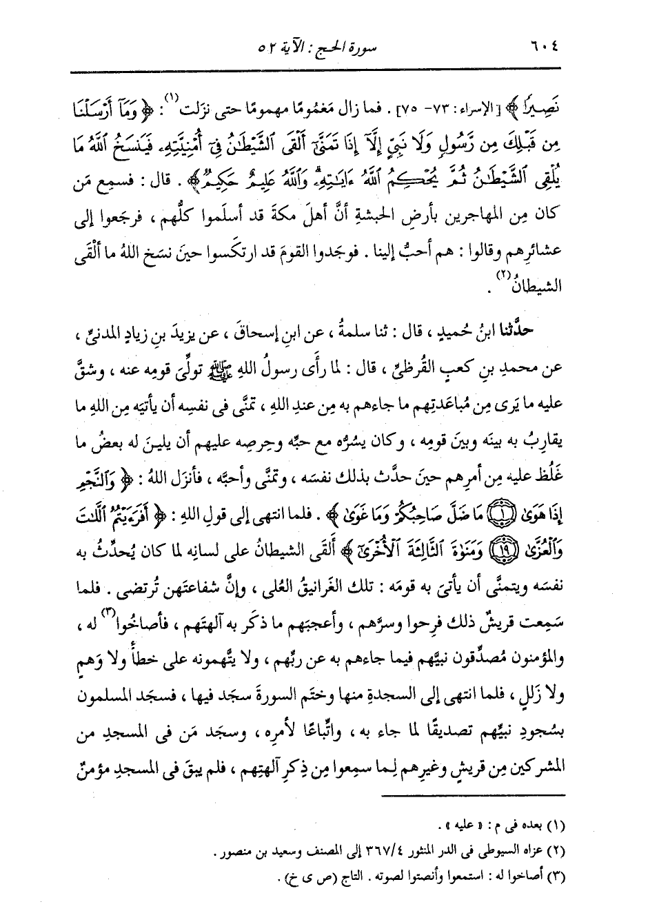 حَدَّثَنَا ابْنُ حُمَيْدٍ، قَالَ: ثنا سَلَمَةُ، عَنِ ابْنِ إِسْحَاقَ، عَنْ يَزِيدَ بْنِ زِيَادٍ الْمَدَنِيِّ، عَنْ مُحَمَّدِ بْنِ كَعْبٍ الْقُرَظِيِّ، قَالَ: " §لَمَّا رَأَى رَسُولُ اللَّهِ صَلَّى اللهُ عَلَيْهِ وَسَلَّمَ تَوَلِّيَ قَوْمِهِ عَنْهُ، وَشَقَّ عَلَيْهِ مَا يَرَى مِنْ مُبَاعَدَتِهِمْ مَا جَاءَهُمْ بِهِ مِنْ عِنْدِ اللَّهِ، تَمَنَّى فِي نَفْسِهِ أَنْ يَأْتِيَهُ مِنَ اللَّهِ مَا يُقَارِبُ بِهِ بَيْنَهُ وَبَيْنَ قَوْمِهِ. وَكَانَ يَسُرُّهُ، مَعَ حُبِّهِ وَحِرْصِهِ عَلَيْهِمْ، أَنْ يَلِينَ لَهُ بَعْضُ مَا غَلُظَ عَلَيْهِ مِنْ أَمْرِهِمْ، حِينَ حَدَّثَ بِذَلِكَ نَفْسَهُ وَتَمَنَّى وَأَحَبَّهُ، فَأَنْزَلَ اللَّهُ: {وَالنَّجْمِ إِذَا هَوَى مَا ضَلَّ صَاحِبُكُمْ وَمَا غَوَى} [النجم: 2] فَلَمَّا انْتَهَى إِلَى قَوْلِ اللَّهِ: {أَفَرَأَيْتُمُ اللَّاتَ وَالْعُزَّى وَمَنَاةَ الثَّالِثَةَ الْأُخْرَى} [النجم: 19] , أَلْقَى الشَّيْطَانُ عَلَى لِسَانِهِ، لَمَّا كَانَ يُحَدِّثُ بِهِ نَفْسَهُ وَيَتَمَنَّى أَنْ يَأْتِيَ بِهِ قَوْمَهُ: «تِلْكَ الْغَرَانِيقُ الْعُلَى، وَإِنَّ شَفَاعَتَهُنَّ تُرْتَضَى» . فَلَمَّا سَمِعَتْ قُرَيْشٌ ذَلِكَ فَرِحُوا وَسَرَّهُمْ، وَأَعْجَبَهُمْ مَا ذَكَرَ بِهِ آلِهَتَهُمْ، فَأَصَاخُوا لَهُ، وَالْمُؤْمِنُونَ مُصَدَّقُونَ نَبِيَّهُمْ فِيمَا جَاءَهُمْ بِهِ عَنْ رَبِّهِمْ، وَلَا يَتَّهِمُونَهُ عَلَى خَطَإٍ , وَلَا وَهْمٍ وَلَا زَلَلٍ. فَلَمَّا انْتَهَى إِلَى السَّجْدَةِ مِنْهَا وَخَتَمَ السُّورَةَ، سَجَدَ فِيهَا. فَسَجَدَ الْمُسْلِمُونَ بِسُجُودِ نَبِيِّهِمْ، تَصْدِيقًا لِمَا جَاءَ بِهِ وَاتِّبَاعًا لَأَمْرِهِ، وَسَجَدَ مَنْ فِي الْمَسْجِدِ مِنَ الْمُشْرِكِينَ مِنْ قُرَيْشٍ وَغَيْرِهِمْ لِمَا سَمِعُوا مِنْ ذِكْرِ آلِهَتِهِمْ، فَلَمْ يَبْقَ فِي الْمَسْجِدِ مُؤْمِنٌ -[605]- وَلَا كَافِرٌ إِلَّا سَجَدَ إِلَّا الْوَلِيدُ بْنُ الْمُغِيرَةِ، فَإِنَّهُ كَانَ شَيْخًا كَبِيرًا فَلَمْ يَسْتَطِعْ، فَأَخَذَ بِيَدِهِ حَفْنَةً مِنَ الْبَطْحَاءِ فَسَجَدَ عَلَيْهَا. ثُمَّ تَفَرَّقَ النَّاسُ مِنَ الْمَسْجِدِ، وَخَرَجَتْ قُرَيْشٌ وَقَدْ سَرَّهُمْ مَا سَمِعُوا مِنْ ذِكْرِ آلِهَتِهِمْ، يَقُولُونَ: قَدْ ذَكَرَ مُحَمَّدٌ آلِهَتَنَا بِأَحْسَنِ الذِّكْرِ، وَقَدْ زَعَمَ فِيمَا يَتْلُو أَنَّهَا الْغَرَانِيقُ الْعُلَى وَأَنَّ شَفَاعَتَهُنَّ تُرْتَضَى وَبَلَغَتِ السَّجْدَةُ مَنْ بِأَرْضِ الْحَبَشَةِ مِنْ أَصْحَابِ رَسُولِ اللَّهِ صَلَّى اللهُ عَلَيْهِ وَسَلَّمَ، وَقِيلَ: أَسْلَمَتْ قُرَيْشٌ. فَنَهَضَتْ مِنْهُمْ رِجَالٌ، وَتَخَلَّفَ آخَرُونَ. وَأَتَى جِبْرَائِيلُ النَّبِيَّ صَلَّى اللهُ عَلَيْهِ وَسَلَّمَ، فَقَالَ: يَا مُحَمَّدُ , مَاذَا صَنَعْتَ؟ لَقَدْ تَلَوْتَ عَلَى النَّاسِ مَا لَمْ آتِكَ بِهِ عَنِ اللَّهِ، وَقُلْتَ مَا لَمْ يُقَلْ لَكَ فَحَزِنَ رَسُولُ اللَّهِ صَلَّى اللهُ عَلَيْهِ وَسَلَّمَ عِنْدَ ذَلِكَ، وَخَافَ مِنَ اللَّهِ خَوْفًا كَبِيرًا، فَأَنْزَلَ اللَّهُ تَبَارَكَ وَتَعَالَى عَلَيْهِ وَكَانَ بِهِ رَحِيمًا يُعَزِّيهِ وَيُخَفِّضُ عَلَيْهِ الْأَمْرَ , وَيُخْبِرُهُ أَنَّهُ لَمْ يَكُنْ قَبْلَهُ رَسُولٌ وَلَا نَبِيُّ تَمَنَّى كَمَا تَمَنَّى وَلَا أَحَبَّ كَمَا أَحَبَّ إِلَّا وَالشَّيْطَانُ قَدْ أَلْقَى فِي أُمْنِيَّتِهِ كَمَا أَلْقَى عَلَى لِسَانِهِ صَلَّى اللهُ عَلَيْهِ وَسَلَّمَ، فَنَسَخَ اللَّهُ مَا أَلْقَى الشَّيْطَانُ , وَأَحْكَمَ آيَاتِهِ، أَيْ: فَأَنْتَ كَبَعْضِ الْأَنْبِيَاءِ وَالرُّسُلِ؛ فَأَنْزَلَ اللَّهُ: {وَمَا أَرْسَلْنَا مِنْ قَبْلِكَ مِنْ رَسُولٍ وَلَا نَبِيٍّ إِلَّا إِذَا تَمَنَّى أَلْقَى الشَّيْطَانُ فِي أُمْنِيَّتِهِ} [الحج: 52] . الْآيَةَ. فَأَذْ
