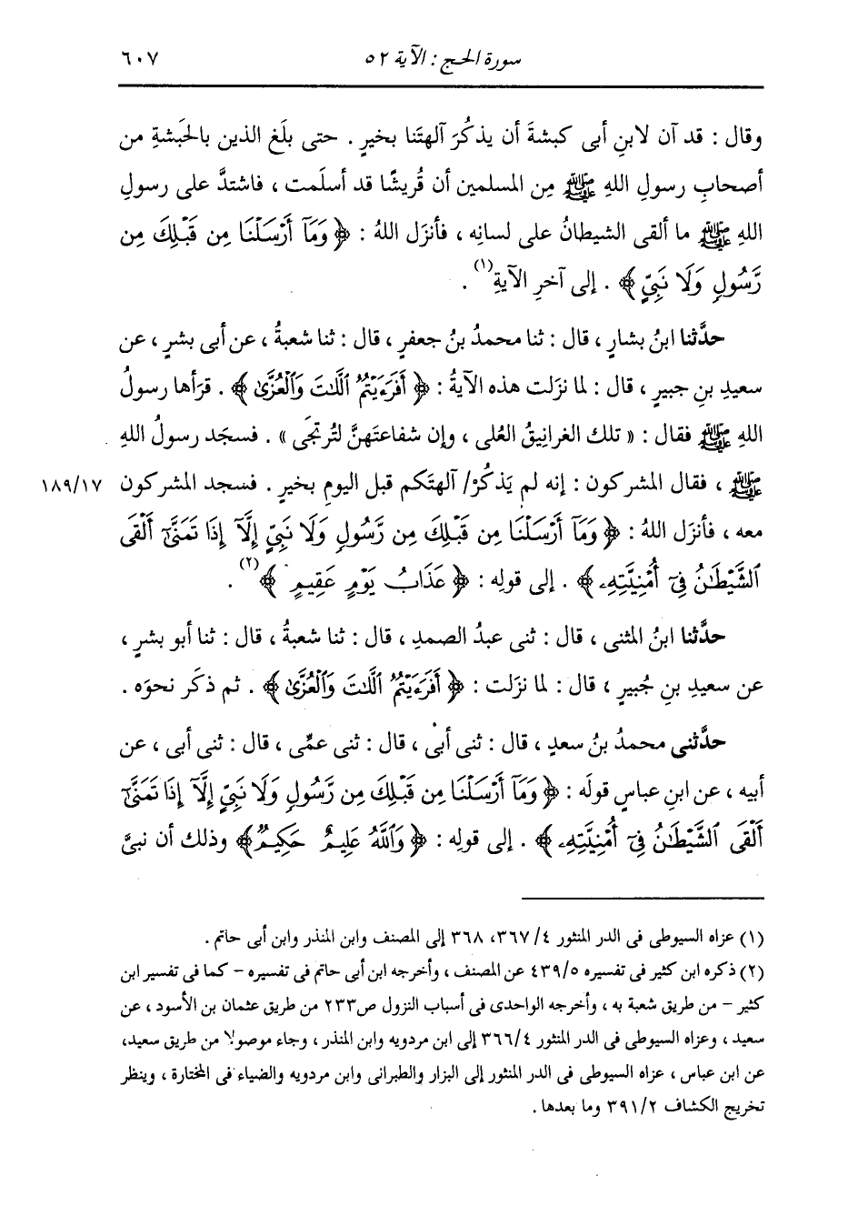 حَدَّثَنَا ابْنُ بَشَّارٍ، قَالَ: ثنا مُحَمَّدُ بْنُ جَعْفَرٍ، قَالَ: ثنا شُعْبَةُ، عَنْ أَبِي بِشْرٍ، عَنْ سَعِيدِ بْنِ جُبَيْرٍ، قَالَ: " §لَمَّا نَزَلَتْ هَذِهِ الْآيَةُ: {أَفَرَأَيْتُمُ اللَّاتَ وَالْعُزَّى} [النجم: 19] قَرَأَهَا رَسُولُ اللَّهِ صَلَّى اللهُ عَلَيْهِ وَسَلَّمَ، فَقَالَ: «تِلْكَ الْغَرَانِيقُ الْعُلَى، وَإِنَّ شَفَاعَتَهُنَّ لَتُرْتَجَى» . فَسَجَدَ رَسُولُ اللَّهِ صَلَّى اللهُ عَلَيْهِ وَسَلَّمَ. فَقَالَ الْمُشْرِكُونَ: إِنَّهُ لَمْ يَذْكُرْ آلِهَتَكُمْ قَبْلَ الْيَوْمِ بِخَيْرٍ فَسَجَدَ الْمُشْرِكُونَ مَعَهُ، فَأَنْزَلَ اللَّهُ: {وَمَا أَرْسَلْنَا مِنْ قَبْلِكَ مِنْ رَسُولٍ وَلَا نَبِيٍّ إِلَّا إِذَا تَمَنَّى أَلْقَى الشَّيْطَانُ فِي أُمْنِيَّتِهِ} [الحج: 52] . إِلَى قَوْلِهِ: {عَذَابَ يَوْمٍ عَقِيمٍ} [الحج: 55] " حَدَّثَنَا ابْنُ الْمُثَنَّى قَالَ: ثني عَبْدُ الصَّمَدِ قَالَ: ثنا شُعْبَةُ قَالَ: ثنا أَبُو بِشْرٍ، عَنْ سَعِيدِ بْنِ جُبَيْرٍ قَالَ: لَمَّا نَزَلَتْ: {أَفَرَأَيْتُمُ اللَّاتَ وَالْعُزَّى} [النجم: 19] ، ثُمَّ ذَكَرَ نَحْوَهُ
