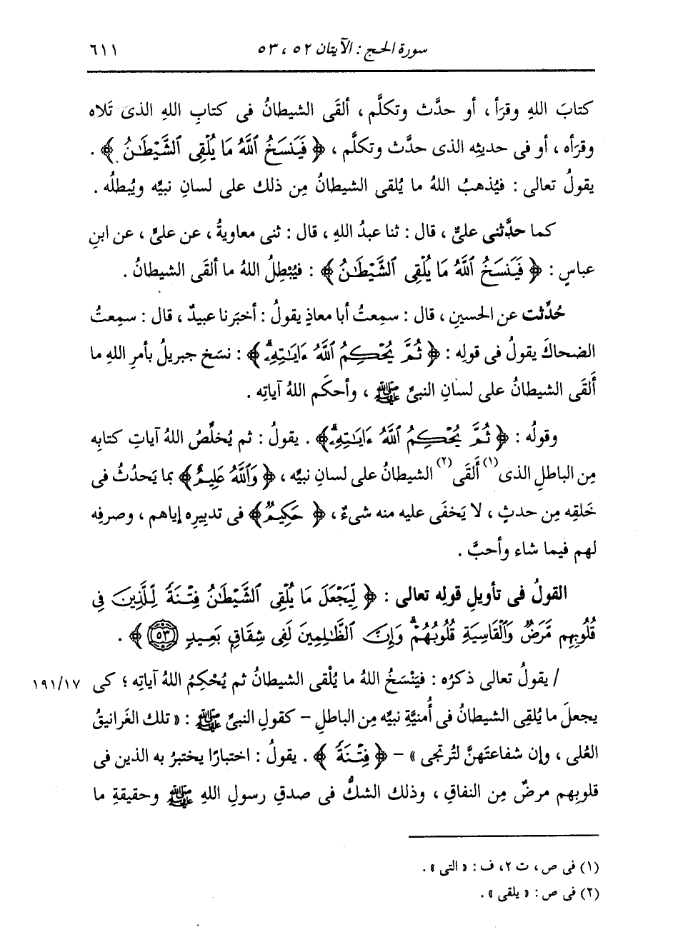 §الْقَوْلُ فِي تَأْوِيلِ قَوْلِهِ تَعَالَى: {لِيَجْعَلَ مَا يُلْقِي الشَّيْطَانُ فِتْنَةً لِلَّذِينَ فِي قُلُوبِهِمْ مَرَضٌ وَالْقَاسِيَةِ قُلُوبُهُمْ وَإِنَّ الظَّالِمِينَ لَفِي شِقَاقٍ بَعِيدٍ} [الحج: 53] يَقُولُ تَعَالَى ذِكْرُهُ: فَيَنْسَخُ اللَّهُ مَا يُلْقِي الشَّيْطَانُ، ثُمَّ يُحْكِمُ اللَّهُ آيَاتِهِ، كَيْ يَجْعَلَ مَا يُلْقِي الشَّيْطَانُ فِي أُمْنِيَّةِ نَبِيِّهِ مِنَ الْبَاطِلِ، كَقَوْلِ النَّبِيِّ صَلَّى اللهُ عَلَيْهِ وَسَلَّمَ: «تِلْكَ الْغَرَانِيقُ الْعُلَى، وَإِنَّ شَفَاعَتَهُنَّ لَتُرْتَجَى» . {فِتْنَةً} [البقرة: 102] يَقُولُ: اخْتِبَارًا يَخْتَبِرُ بِهِ الَّذِينَ فِي قُلُوبِهِمْ مَرَضٌ مِنَ النِّفَاقِ؛ وَذَلِكَ الشَّكُّ فِي صِدْقِ رَسُولِ اللَّهِ صَلَّى اللهُ عَلَيْهِ وَسَلَّمَ , وَحَقِيقَةِ مَا -[612]- يُخْبِرُهُمْ بِهِ. وَبِنَحْوِ الَّذِي قُلْنَا فِي ذَلِكَ قَالَ أَهْلُ التَّأْوِيلِ