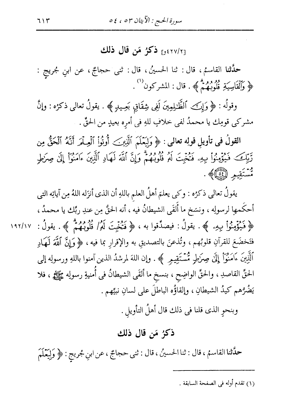 ذِكْرُ مَنْ قَالَ ذَلِكَ: حَدَّثَنَا الْقَاسِمُ، قَالَ: ثنا الْحُسَيْنُ، قَالَ: ثني حَجَّاجٌ، عَنِ ابْنِ جُرَيْجٍ: {وَالْقَاسِيَةِ قُلُوبُهُمْ} [الحج: 53] قَالَ: «§الْمُشْرِكُونَ»